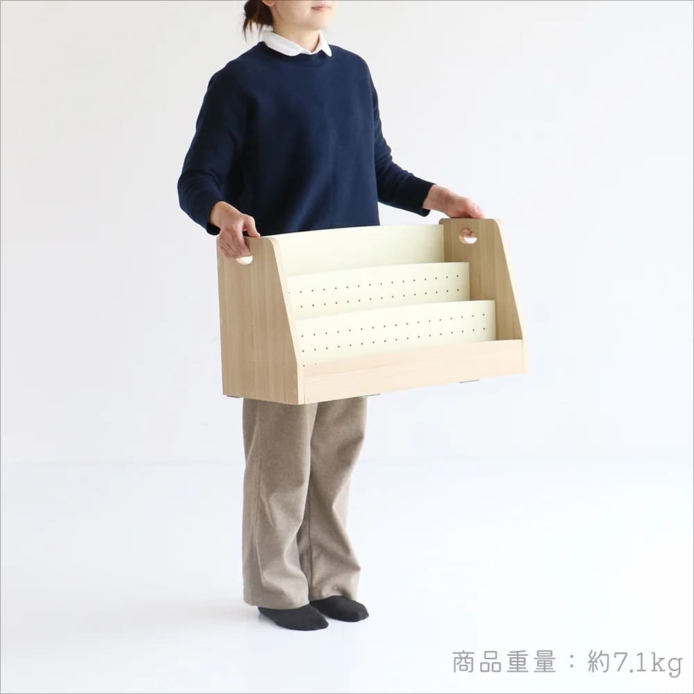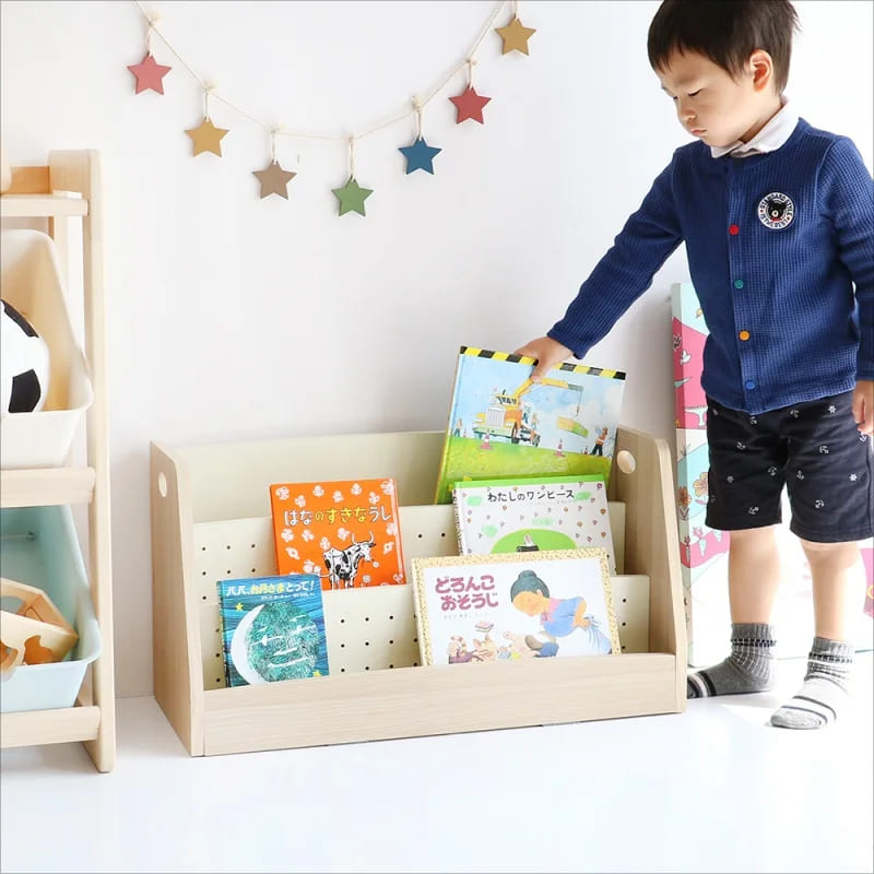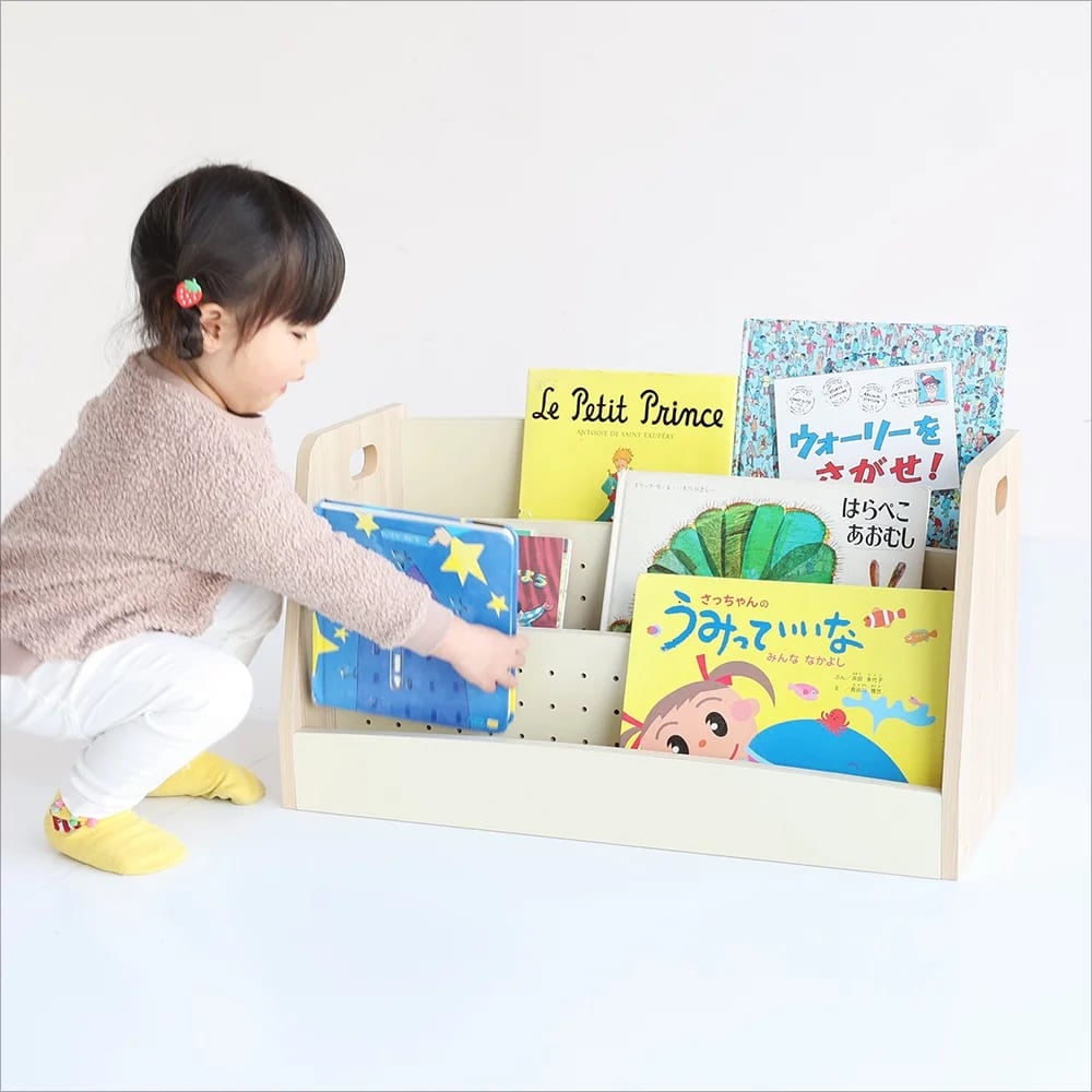 約35cmの低い高さで設計された絵本ラックです。 小さな子どもが自分ひとりで簡単に絵本を取り出すことができます。