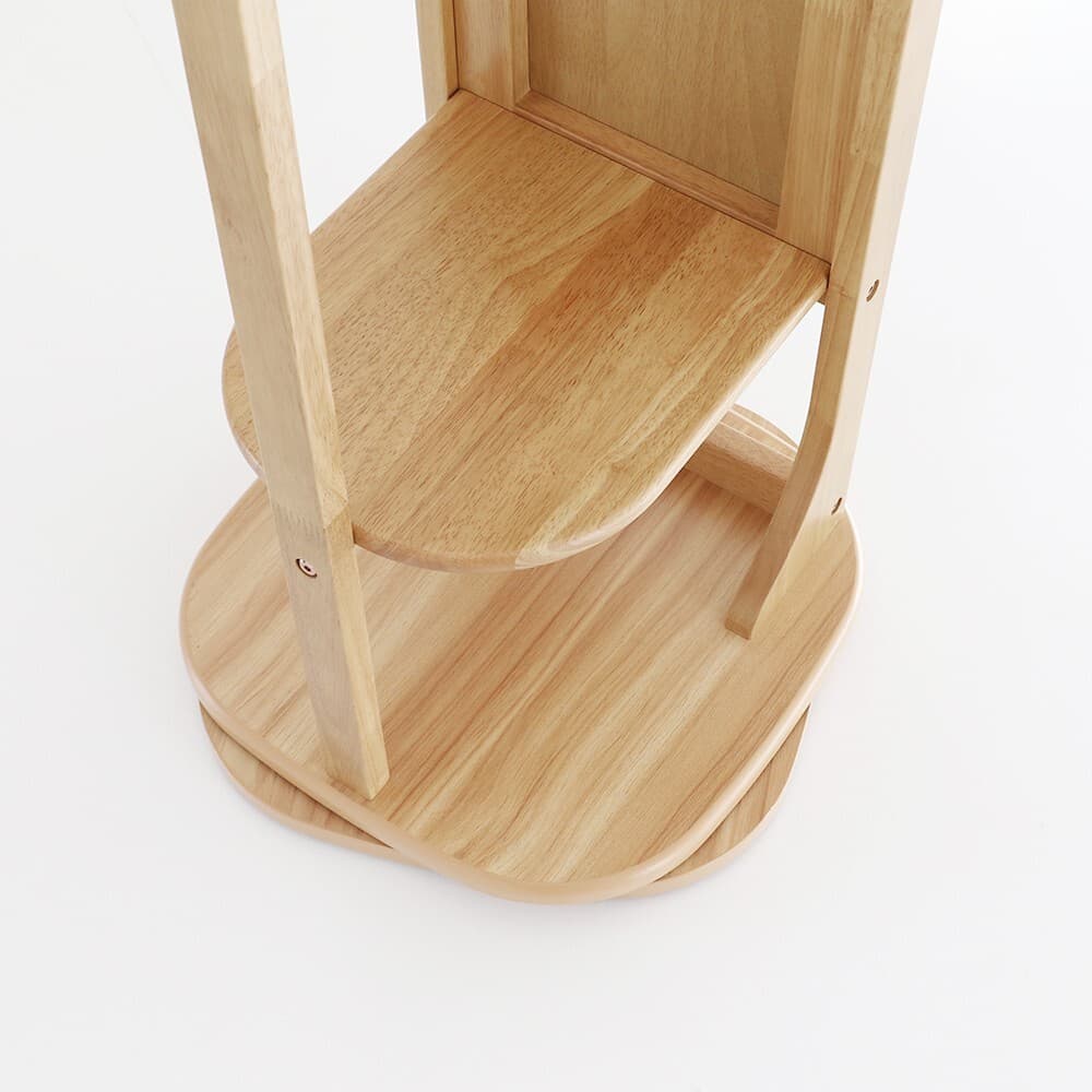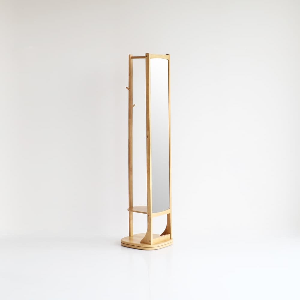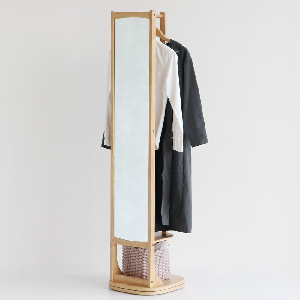 全身ミラーとハンガーラックがひとつになった、一台二役の便利なアイテムです。 ハンガーラックからサッと洋服を取り出し、その場でスタイリングをチェックできるため、忙しい朝の身支度がスムーズに完結いたします。 土台が360度回転する設計を採用しております。 くるっと回すだけで、洋服や鏡、背面の収納スペースへ簡単にアクセス可能。 限られたスペースでも、場所を選ばず快適にご使用いただけます。