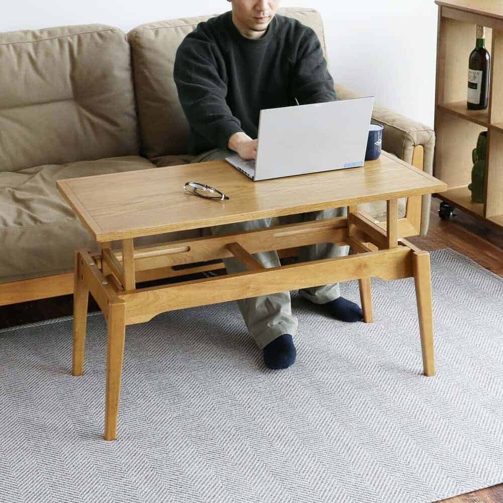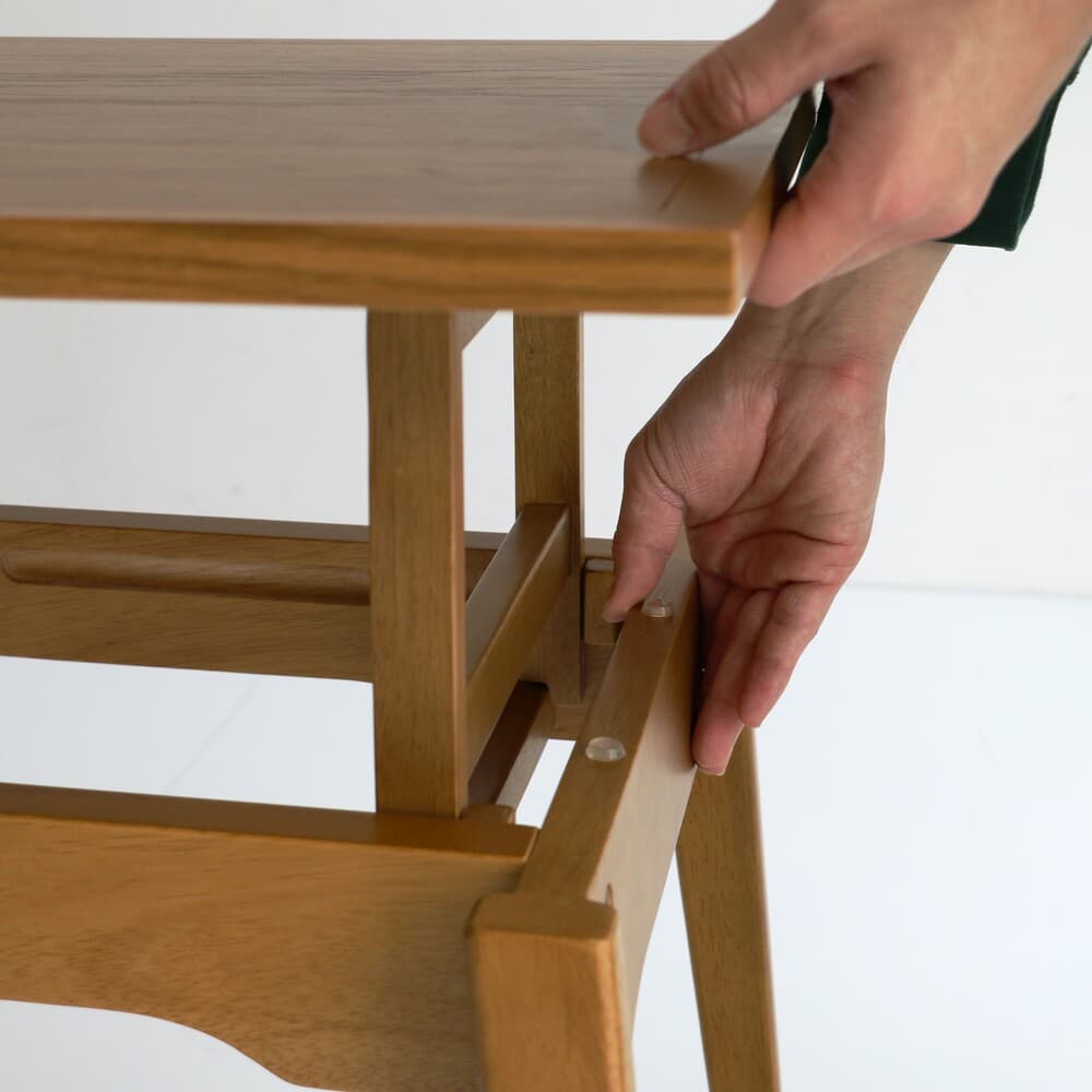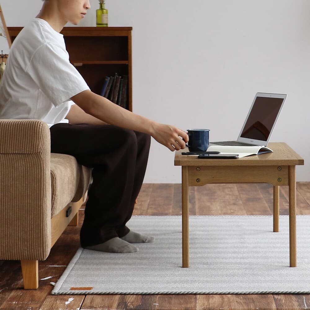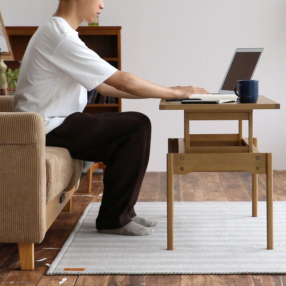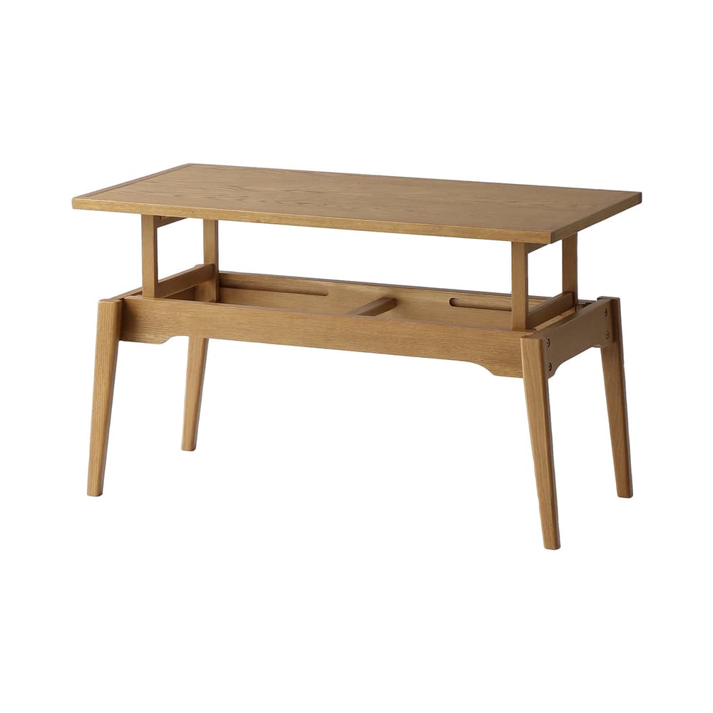 ライフスタイルやシーンに合わせて、2段階の高さ調節ができる機能的なリビングテーブルです。 天然木の美しい質感を活かしたシンプルな佇まいで、日々の暮らしに優しく寄り添います。 ライフスタイルに合わせて、天板の高さを2段階で切り替えられます。 高さ37.5cmの設定では、床に座ってくつろぐ際や、ソファでのリラックスタイムにぴったりのローテーブルとして。 高さ55cmに上げれば、ソファに座った状態でのPC作業や食事がスムーズに行える、使い勝手の良いセンターテーブルへと早変わりします。 天板の縁には繊細な溝のラインを施し、洗練されたデザインのアクセントに仕上げました。 細かなディテールにまでこだわることで、単なる家具以上の愛着を感じさせてくれます。 その時々の過ごし方に合わせて快適な環境を整えてくれる、実用性と意匠性を兼ね備えた一台です。
