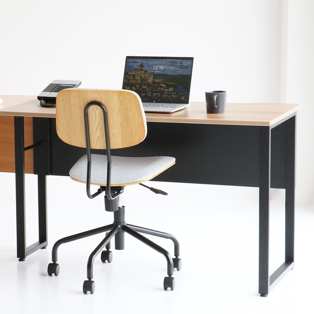 温かみのある木目調の天板に、スタイリッシュなスチール脚を組み合わせた、機能美溢れる基本デスクです。 単体での個人用デスクとしてはもちろん、複数台を連結することでミーティングルームや会議室など、幅広いビジネスシーンで活躍いたします。 幅1200mmの天板はフラットな設計となっており、作業スペースを広々と確保。 素材にはキズや水に強いメラミン樹脂を採用しているため、日々のお手入れも簡単で、長く清潔にお使いいただけます。 また、壁面にぴったりと設置できるよう、コードを通せる便利なスリットを設けました。配線周りもスッキリと整います。 本製品は、別売りの「Free Office Desk -connect-(OFT-3854)」と最大3台まで横並びに連結が可能です。