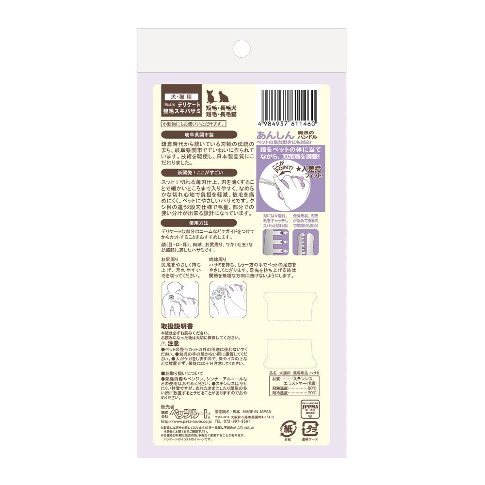 スッと!切れる薄刃仕上、毛束に入りやすく、なめらかな切れ心地で毛への負担を軽減、被毛を痛めにくくなっています。ペットにやさしいスキバサミです。先丸で顔周りも安心、クシ目の違う2段刃仕様、刃先にはV溝付き毛をキャッチしやすい設計になっています。刃物の伝統の町岐阜県関市製。