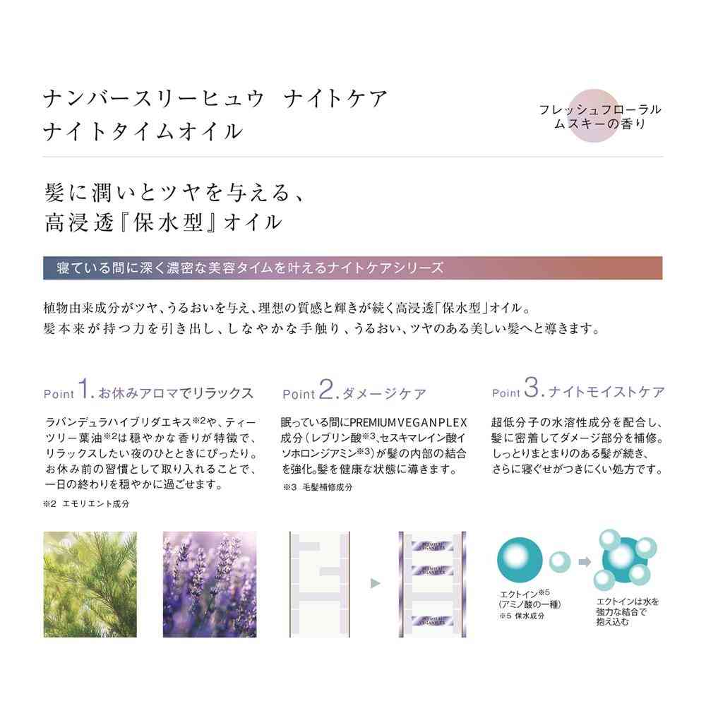 優眠美容/夜、眠るだけで美しく。 寝ている間に深く濃密な美容タイムへ導く、ヒュウナイトケアシリーズ。 睡眠中に髪を乾燥や摩擦から守り、補修成分が浸透。 翌朝の寝ぐせやダメージをケアします。 忙しく朝のケアに時間をかけられない方に最適です。 【ナイトタイムオイル特徴】 髪本来の力を高め、理想の質感と輝きが続く高浸透「保水型」オイルでしなやかでツヤのある美しい髪へ導きます。 【香り:フレッシュフローラルムスキー調の香り】 上質なホワイトリリーを基調に、瑞々しいスイートオレンジやネロリ、ラベンダーを加えてアレンジ。甘さと爽やかさのある安らぎの香りがやさしく眠りに導きます。