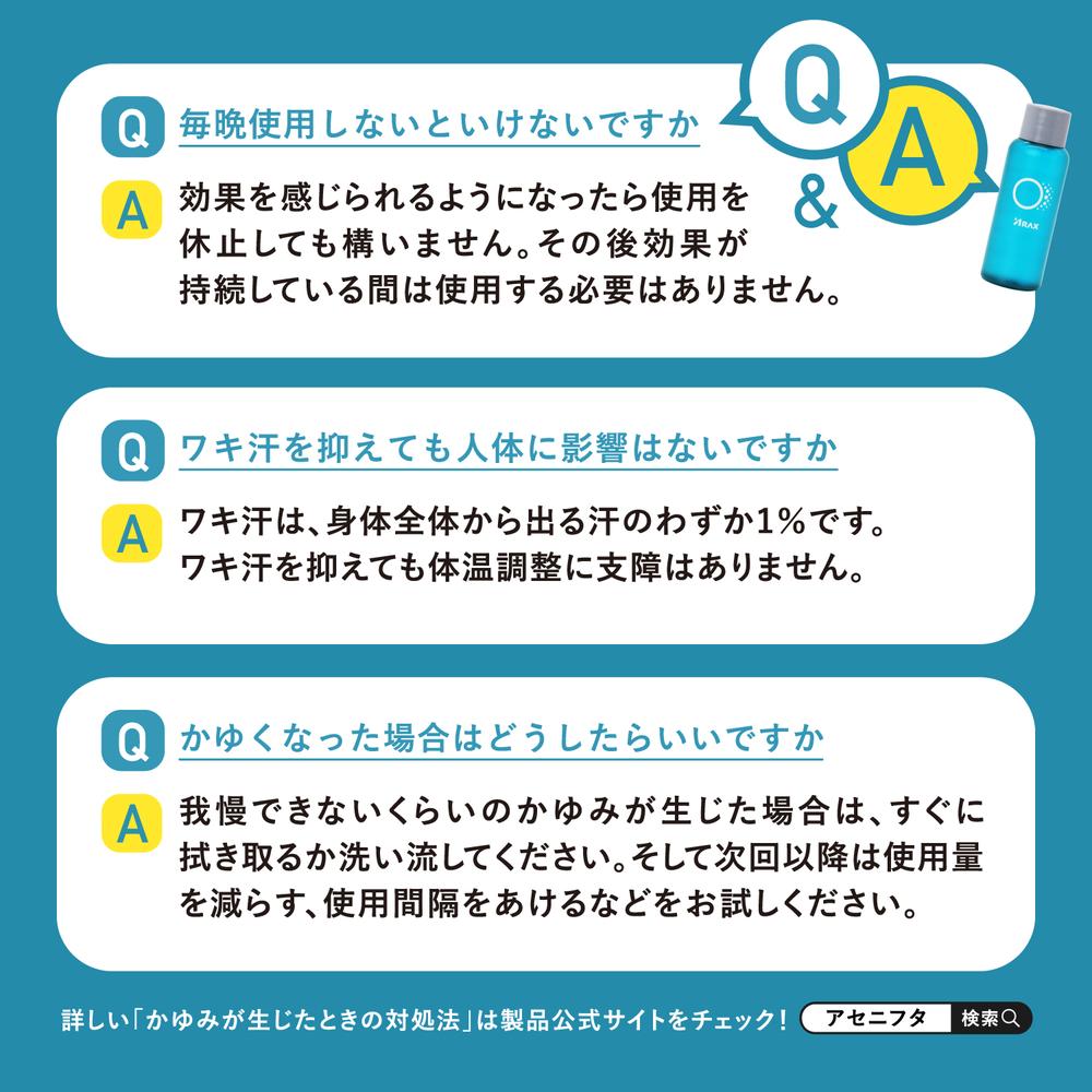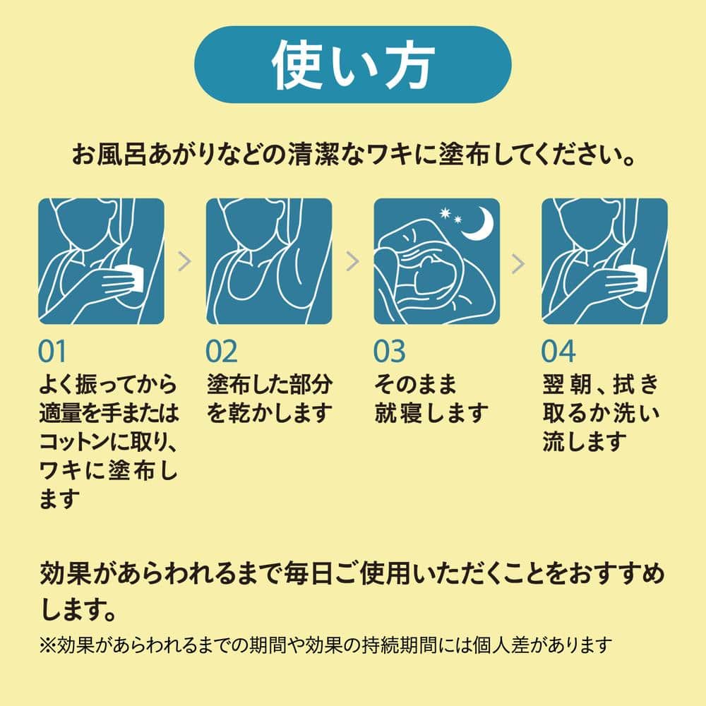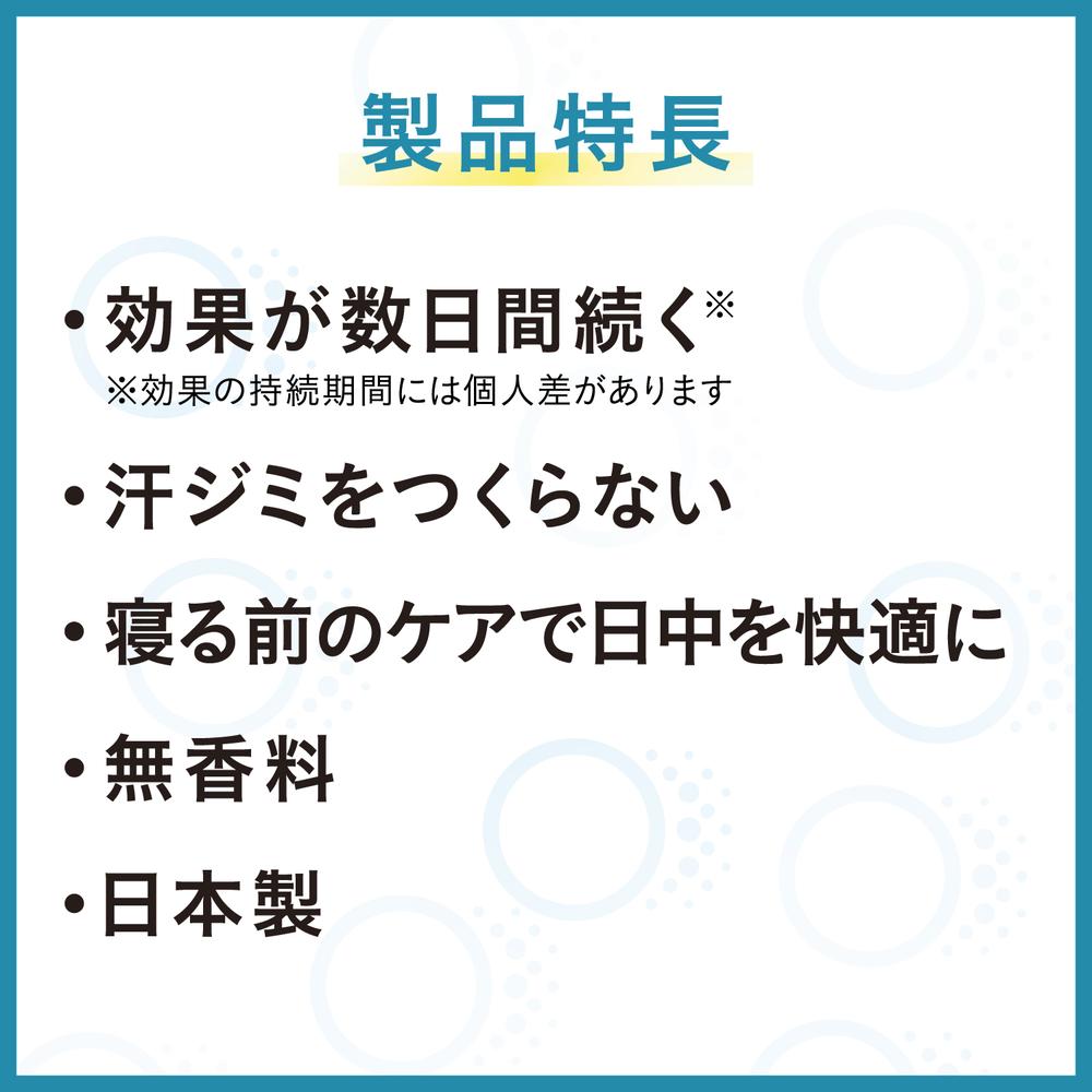 塩化アルミニウムが蓋をして、ワキ汗・ニオイをピタッと元から塞ぐ ●効果が数日間続く 汗腺に蓋が形成されるとボディソープなどでは洗い流されず、数日間効果が持続します※。 ※効果の持続期間には個人差があります ●汗ジミをつくらない 汗を元から塞ぐから洋服に汗ジミができません。 ●寝る前のケアで日中を快適に 入浴後~就寝前に塗布するだけ。日中に塗り直す必要はありません。 ●無香料 香りでニオイをごまかしません。香料が苦手な方でもご利用いただけます。