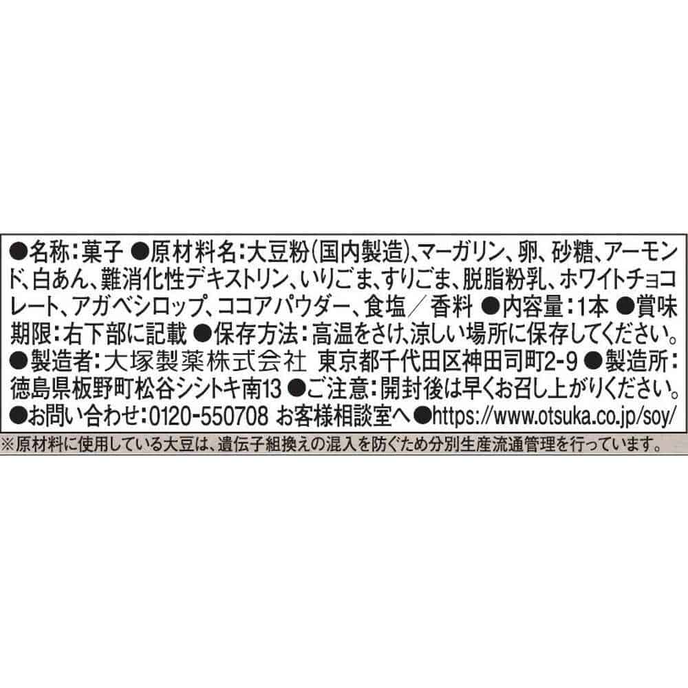 大豆粉(国内製造)、マーガリン、卵、砂糖、アーモンド、白あん、難消化性デキストリン、いりごま、すりごま、脱脂粉乳、ホワイトチョコレート、アガベシロップ、ココアパウダー、食塩