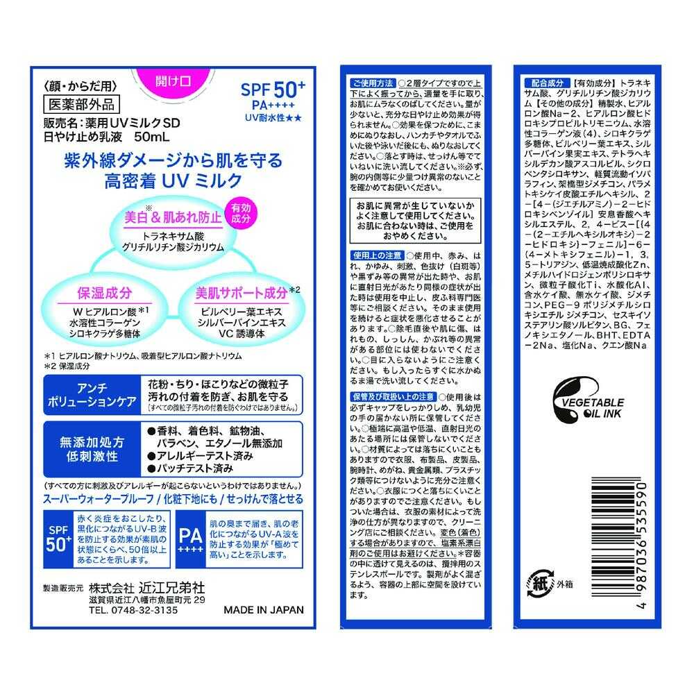 紫外線ダメージから肌を守る高密着UVミルク ■美白&肌あれ防止 【有効成分】トラネキサム酸・グリチルリチン酸ジカリウム ■保湿成分:Wヒアルロン酸(※1)・水溶性コラーゲン・シロキクラゲ多糖体 (※1)ヒアルロン酸ナトリウム、吸着型ヒアルロン酸ナトリウム ■美肌サポート成分(※2) ビルベリー葉エキス・シルバーバインエキス・VC誘導体 (※2)保湿成分 ■アンチポリューションケア 花粉・ちり・ほこりなどの微粒子汚れの付着を防ぎ、お肌を守る (すべての微粒子汚れの付着を防ぐわけではありません。) ■無添加処方・低刺激性 ●香料、着色料、鉱物油、パラベン、エタノール無添加 ●アレルギーテスト済み ●パッチテスト済み (すべての方に刺激及びアレルギーが起こらないというわけではありません。) ■スーパーウォータープルーフ/化粧下地にも/せっけんで落とせる