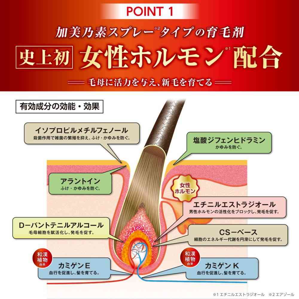 加美乃素男性用エアゾールタイプ育毛剤として史上初、女性ホルモン(エチニルエストラジオール)を配合。 女性ホルモン(エチニルエストラジオール)を含む8種の有効成分が髪の成長サイクルに働きかけ、育毛、発毛を促します。 注目成分:亜鉛(塩化亜鉛:湿潤剤)、プロテイン(大豆たん白加水分解物(2):湿潤剤)配合。