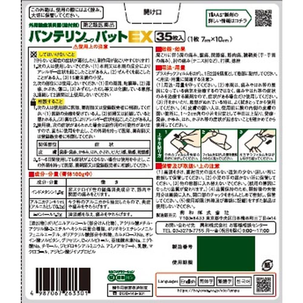 プラスチックフィルムをはがし、1日2回を限度として患部に貼付してください。