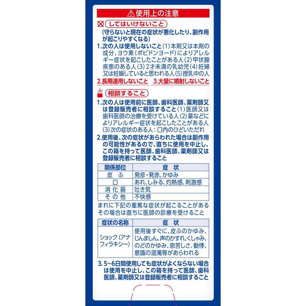 ●1)のど粘膜の細菌などを殺菌・消毒するスプレータイプののど薬 2)長いノズルで患部に効き目がしっかり届く 3)携帯しやすく必要な時に使える