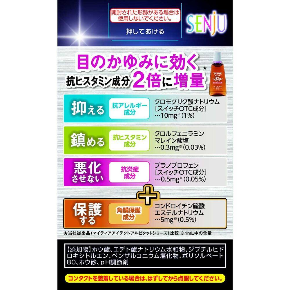 ・使用方法を守ってご使用下さい。 ・点鼻薬と併用する場合には、乗物または機械類の運転操作をしないで下さい。 ・目薬を使う前に目についた花粉などの原因物質を洗いながしましょう。 ・かゆくても目をこすらないように注意して下さい。 ・かゆみが強い時は冷たいタオルなどを目にあてるとおさまることもありますので、お試し下さい。 ・2日間使用しても症状が良くならない場合、症状の改善がみられても、2週間を超えて使用する場合は医師・薬剤師・登録販売者にご相談下さい。 ・使用前に、よく添付文書をお読みになってからご使用下さい。その際、ご不明な点がございましたら、薬剤師・登録販売者にご相談下さい。商品説明本品はアレルギー症状が続き,かつ炎症を伴う方におすすめします。 ■特徴 花粉などによる目のアレルギー症状は,炎症も引き起こします。そして,炎症は,目のかゆみだけではなく,異物感・充血などの症状を悪化(強く感じる)させます。 ●3つの有効成分※1のはたらきで,炎症をともなう花粉などによる目のアレルギー症状〈かゆみ・異物感(コロコロする感じ)・充血など〉に効果を発揮します。 ●その他、角膜を保護する成分※2も配合しています。 ●クール感(清涼感)のないやさしいさし心地の目薬です。 ※1 クロモグリク酸ナトリウム[スイッチOTC成分],クロルフェニラミンマレイン酸塩,プラノプロフェン[スイッチOTC成分] ※2 コンドロイチン硫酸エステルナトリウム