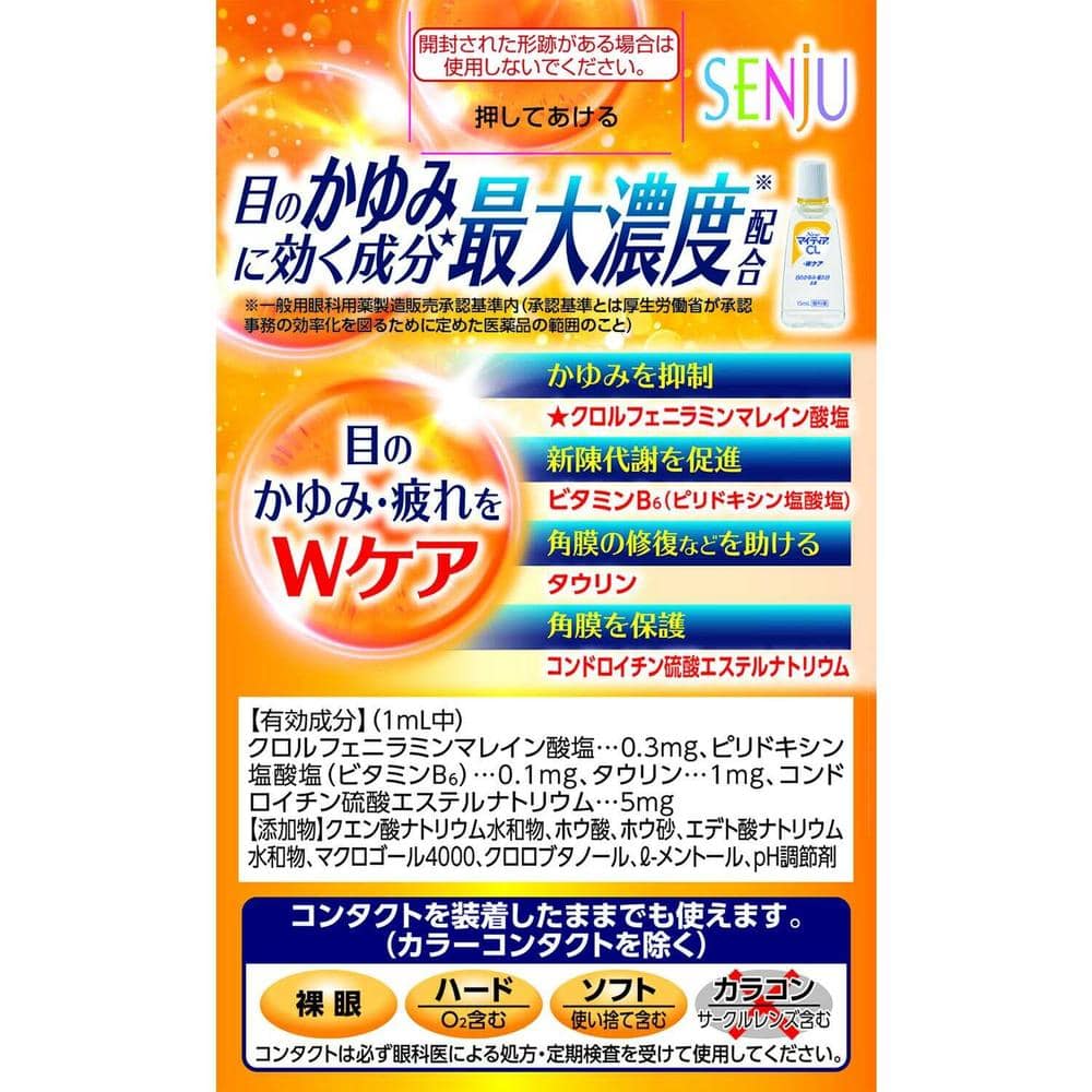 商品説明ソフトコンタクトレンズを装着したまま目薬を使用する場合は,外箱や添付文書を確認し,必ずソフトコンタクトレンズ装着中に使用できる目薬を使用しましょう。 ■特徴 ●カラーコンタクトレンズを除くすべてのコンタクトレンズ(ハード・ソフト)を装着したまま使用いただけます。 ●コンタクトレンズを装着されていない方も使用いただけます。 ●目のかゆみを抑える抗ヒスタミン成分クロルフェニラミンマレイン酸塩を最大濃度※配合。目の新陳代謝を促進するビタミンB6(ピリドキシン塩酸塩),角膜の修復などを助けるタウリン,角膜を保護するコンドロイチン硫酸エステルナトリウムを配合。目のかゆみだけでなく目の疲れなどにも効果をあらわします。 ●清涼感のある,冷たいさし心地です。 ※一般用眼科用薬製造販売承認基準内 【承認基準とは】厚生労働省が承認事務の効率化を図るために定めた医薬品の範囲のこと