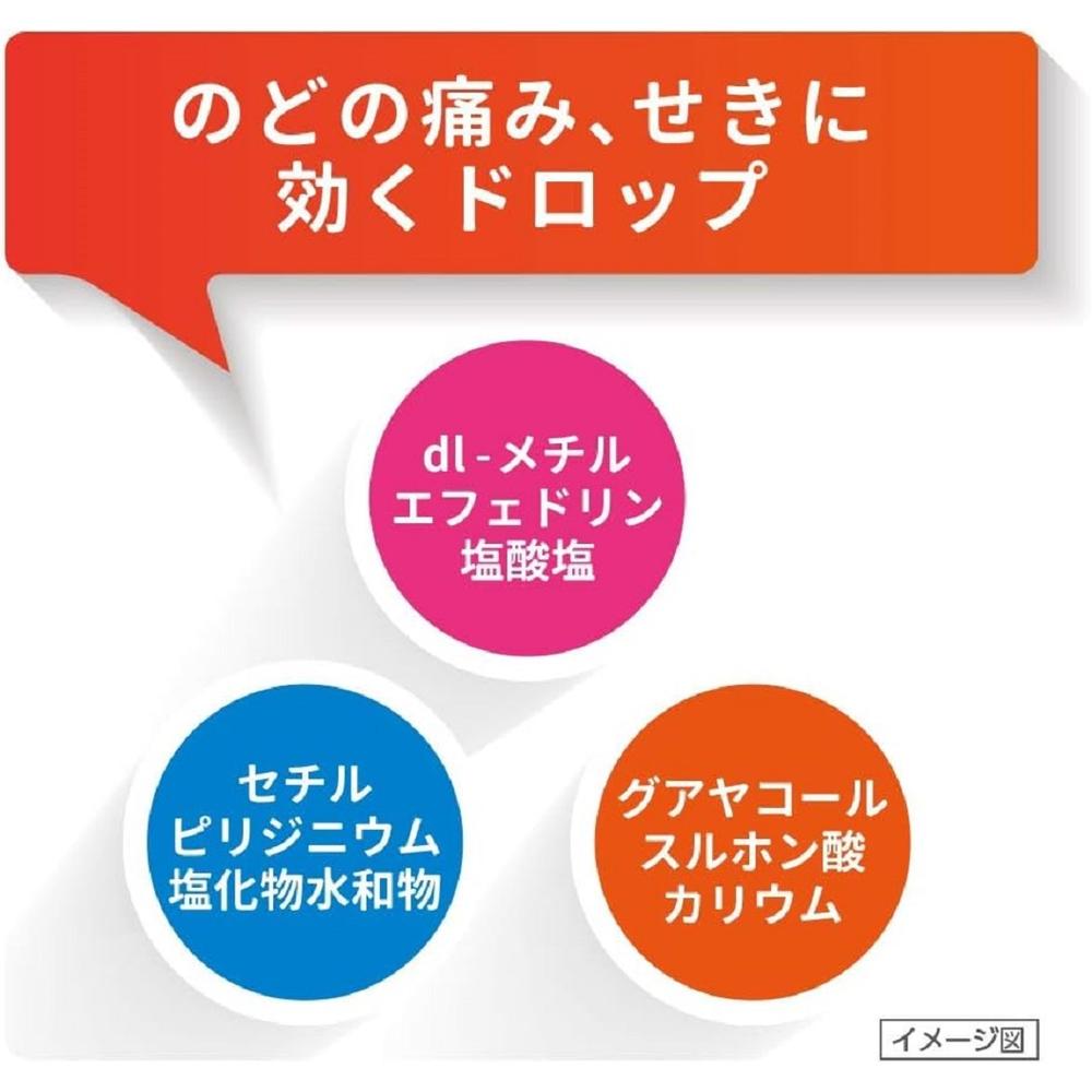 ・せきを抑えるメチルエフェドリン塩酸塩、たんに効くグアヤコールスルホン酸カリウム、のどの殺菌成分セチルピリジニウム塩化物水和物を配合した、のどの痛み、せきに効くドロップです。
