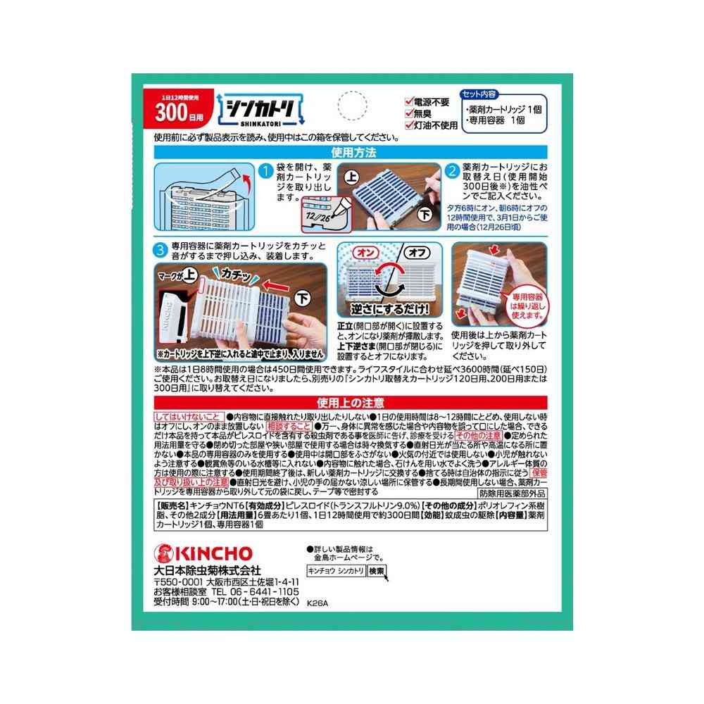 SHINKATORI.次世代型屋内蚊取り。 部屋に置くだけ蚊が落ちる。 電源不要!無臭。 灯油不使用。 長期間1日12時間使用300 日用。 電源も電池も不要、オン・オフは片手で容器を上下逆さまにするだけの簡単操作。 (オン:青いメッシュが見える⇔オフ:グレーのシャッターが閉まりメッシュが見えない) リサイクル(PET→カートリッジ)。 電源不要でどこにでも置ける ●火気に対する心配がなく、置いたままでも安心。 ●お子様、犬、猫のいるご家庭でも使えます。玄関、寝室、子供部屋。 【セット内容】薬剤カートリッジ1個、専用容器 1個 KINCHO独自の非加熱式薬剤拡散システムエアフローリリース技術 屋内の空気の流れを利用、お部屋に薬剤が拡散。 置くだけで約300日間、蚊のいない屋内空間をつくります。(使用環境により効果は異なります。)
