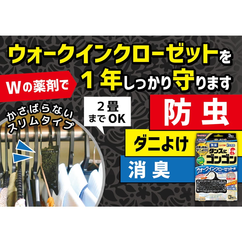 金鳥独自のW処方。 揮散性の高い成分と高活性殺虫成分で広く早く効く、衣類用防虫剤。 ウォークインクローゼット約2畳(7500L)に対して、3個使用が目安。 無臭。