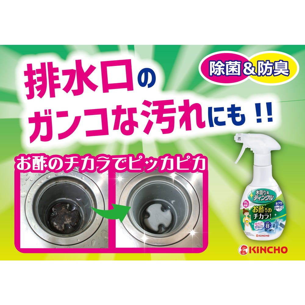 ●必ず使用前に表示をお読み下さい。 【使用上の注意】 ●用途外に使わない。 ●効果が落ちるので塩素系の洗浄剤や漂白剤、ヌメリ取り剤とは併用しない。 ●使用の時は炊事用等の手袋を着用する。 ●換気をよくして使う。 ●人に向けてスプレーしない。 ●目より高い場所で使用する時はスポンジや布につけて洗う。 ●プラスチック製品(人造大理石を含む)の一部、塗装面にはシミになるものがあるので、目立たない場所で試してから使用し、すぐに水で洗い流すか水拭きする。 ●頑固な水アカ汚れは、乾燥後白膜が現れて取り除けない場合があります。これは水道水などに含まれるケイ酸が蓄積したもので、本品では落としきれません。液体タイプのクレンザー等でこすり取って下さい。 ●使用後は手をよく水で洗う。 ●子供の手が届く所に置かない。 【応急処置】 ●目に入った時はこすらずにすぐ水で充分洗い流す。 ●飲み込んだ時は水を飲ませる等の処置をする。 ●皮膚についた時は水で充分洗い流す。 ●異常がある時は商品を持参し、医師に相談する。 【ボトルへのつめかえ方】 (注ぎ口の切り方) 1.上から点線の方向にゆっくりと切って下さい。 (注ぎ方) 2.注ぎ口をさし込み、泡立たないようにゆっくり注いで下さい。 *切る際には中身の飛び出しと切り口にご注意下さい。 *他の洗剤等とまぜないで下さい。 *必ず「水回り用ティンクル」のボトル(300mL)につめかえて下さい。 *あふれないように、液を使い切ってからつめかえて下さい。つめかえた後はボトルの表示をよく読んでお使い下さい。 【使えないもの】 白木等水がしみこむ材質や家具、大理石等の石材、電気製品、スチロール樹脂製品※液が付着した場合はすぐに水で洗い流すか水拭きする。 【使用の目安】 洗浄・除菌には:1m2に約8回噴射 防臭には:排水口内に約5回噴射