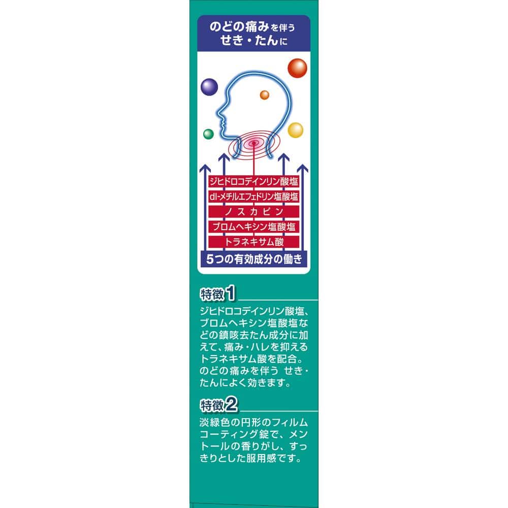 ●ジヒドロコデインリン酸塩、ブロムヘキシン塩酸塩などの鎮咳去たん成分に加えて、痛み・ハレを抑えるトラネキサム酸を配合。のどの痛みを伴う せき・たんによく効きます。