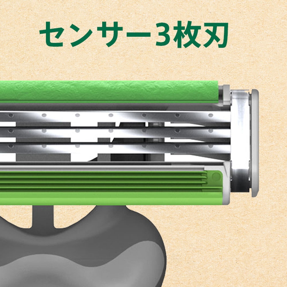◆コンフォートジェルで究極のやさしさ **カスタムプラスEXと比較 ★7つのジレットテクノロジー ●再生プラスチック使用 ハンドルに90%再生プラスチック使用。 ●ジェルシールドテクノロジー 水を保護クッションに変換し、快適でやさしい剃り心地。 ●クリーン構造 刃を簡単に洗浄できて、清潔さを保つ。 ●潤滑スムーサー 潤滑成分がすべりをよくし、なめらかに剃れる。 ●センサー3枚刃 1枚1枚の刃が、肌の凹凸を感知して深剃り。 ●コンフォートガード ヒゲを根元から立たせて、深剃りを可能に。 ●首振りヘッド 顔の曲面に密着して、快適な剃り心地。