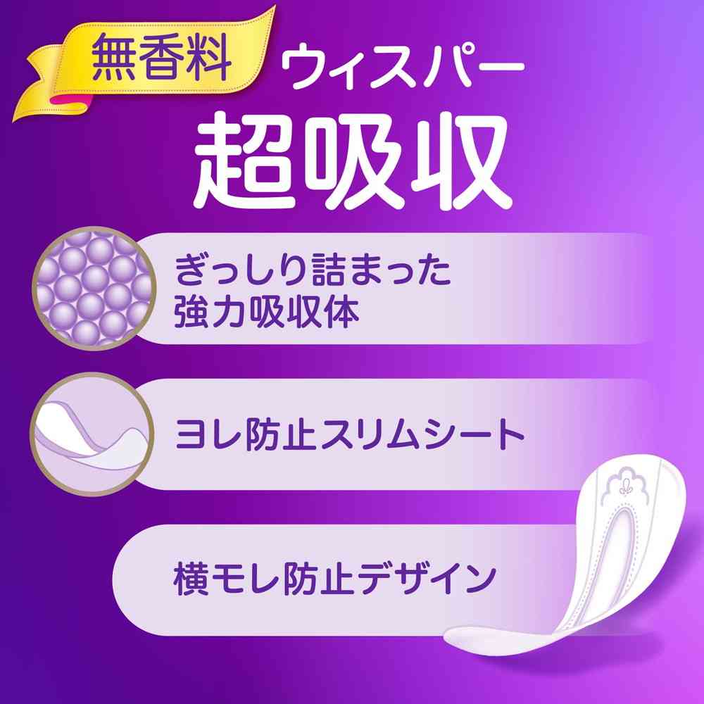 ウィスパー、Whisper、うぃすぱー、パンティライナー、ぱんてぃらいなー、ナプキン、うすさら安心、超吸収、超消臭、軽度尿もれ、大人用紙おむつ、ライナー、さわやかな香り、Discreet
