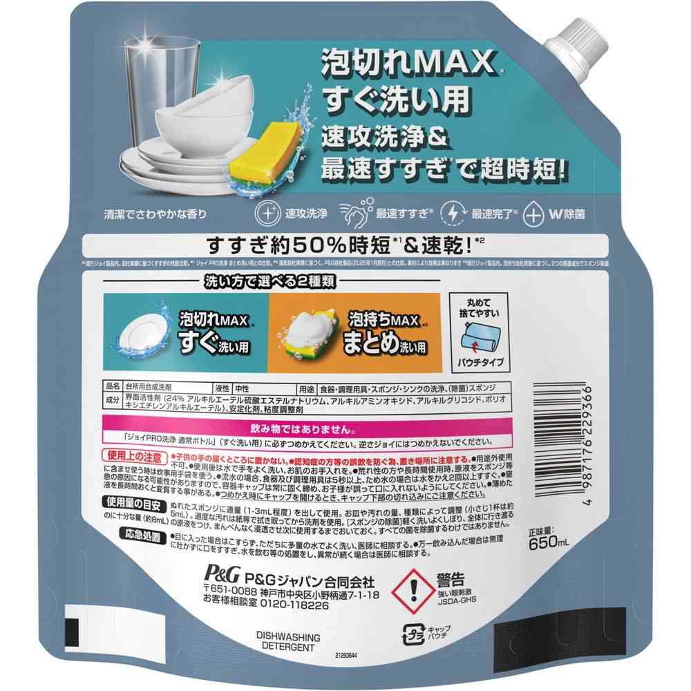P&G、ピーアンドジー、ジョイ、JOY、じょい、PRO、PRO洗浄、プロ洗浄、プロ、食器用洗剤、食洗、食器洗い、食器、洗剤、お皿洗い、皿洗い、キッチン洗剤、キッチン、台所洗剤、台所、すぐ洗い、すぐ洗い用、詰替、詰替え、詰め替え、つめかえ、レフィル、特大、大容量、速乾、泡切れ、時短