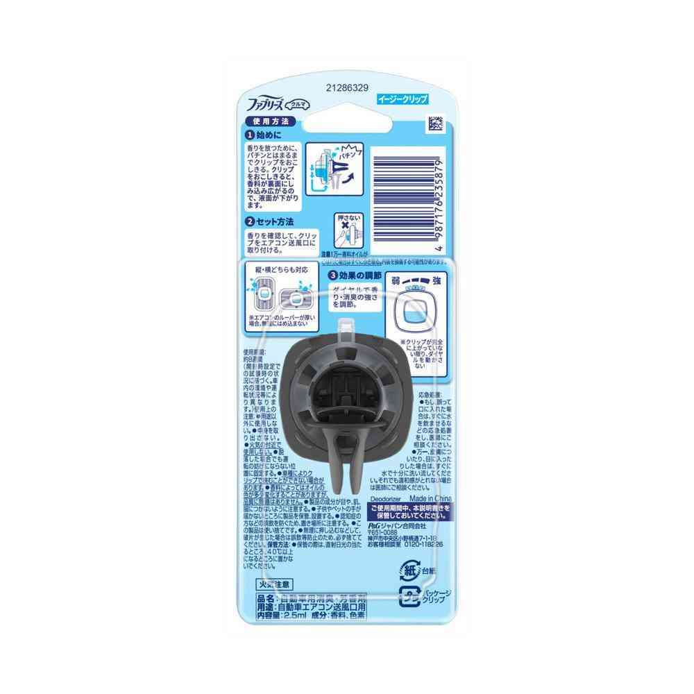 車用エアコン送風口に簡単装着できるクリップタイプの消臭芳香剤 消臭成分最高レベル(ファブリーズ車シリーズ内)で強力にニオイを消臭 香りと消臭効果をダイヤルで調節可能 風とともに香りが広がり、車内全体を爽やかに保つ 約8週間持続(使用状況により変わります)