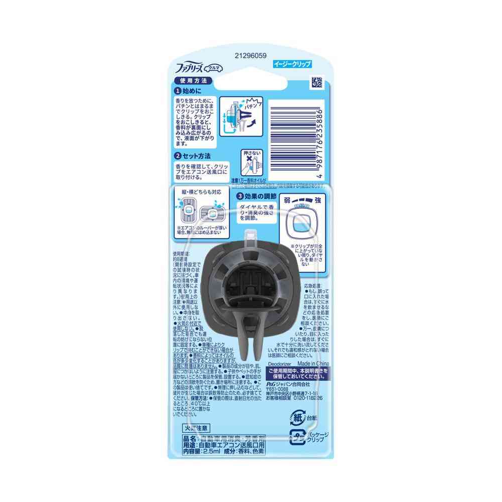車用エアコン送風口に簡単装着できるクリップタイプの消臭芳香剤 消臭成分最高レベル(ファブリーズ車シリーズ内)で強力にニオイを消臭 香りと消臭効果をダイヤルで調節可能 風とともに香りが広がり、車内全体を爽やかに保つ 約8週間持続(使用状況により変わります)