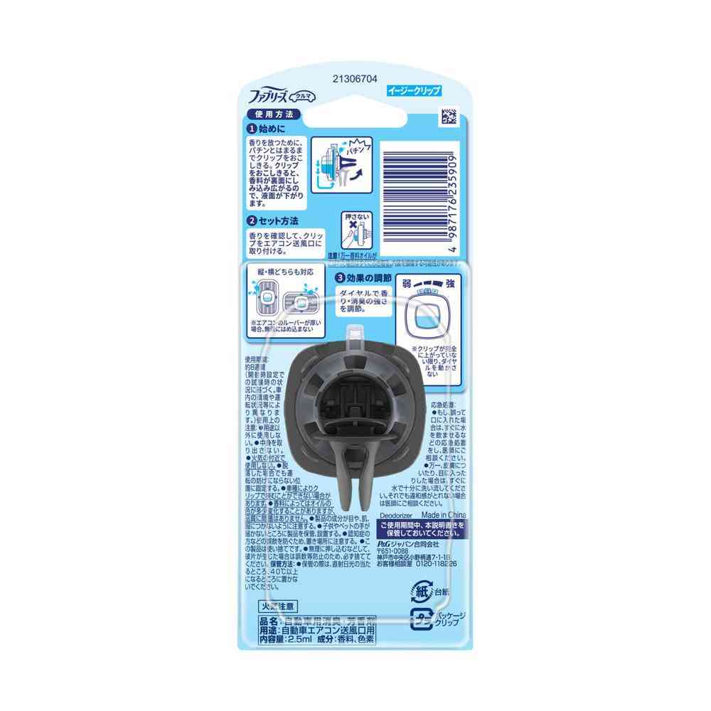 車用エアコン送風口に簡単装着できるクリップタイプの消臭芳香剤 消臭成分最高レベル(ファブリーズ車シリーズ内)で強力にニオイを消臭 香りと消臭効果をダイヤルで調節可能 風とともに香りが広がり、車内全体を爽やかに保つ 約8週間持続(使用状況により変わります)