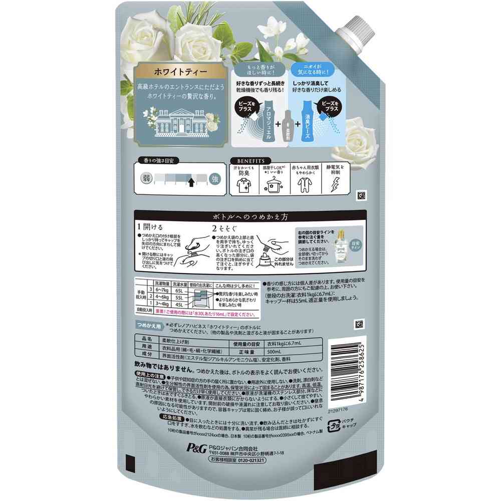 P&G、P&Gジャパン、P&Gジャパン合同会社、ピーアンドジー、レノア、レノアハピネス、夢ふわタッチ、柔軟剤、ソフナー、香りづけ、洗濯、洗濯洗剤、ホワイトティー、詰替、詰替え、つめかえ、レフィル、詰め替え