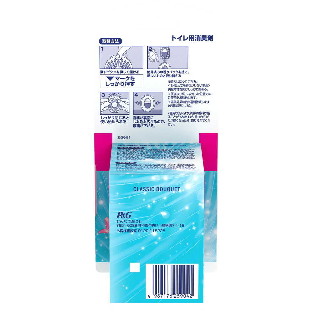 生まれかわった!つめかえタイプ 旧タイプにはつめかえできません。 トイレのニオイ分子は、壁や床の小さな凹凸に隠れています。 ファブリーズのトイレ用消臭剤は、室内の空気を継続的に消臭だけでなく、壁や床を防臭コートすることで、嫌なニオイが付着するのを防ぎます。 消臭効果は約8週間持続します(使用状況による)。 クラシック・ブーケの香り お得なつめかえパック4回分。必ず本体ケース入り商品をお買い求めください。