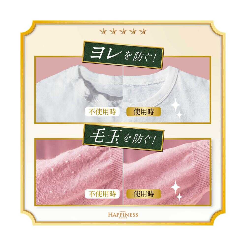 ウォームコットン&すずらんの香り:いつまでも包まれていたい、洗いたてのリネンのように透明感ある香り。 5つ星ホテル推奨!新レノアハピネス夢ふわタッチで衣類のダメージを防ぎ、香りも肌ざわりも5つ星。 新レノアハピネス夢ふわタッチは、洗濯するたび気になる衣類のダメージまで防ぐ!Tシャツの首元のヨレやニットの毛玉を防ぎます*。 *新品から複数回洗濯した場合。メーカー洗剤比。