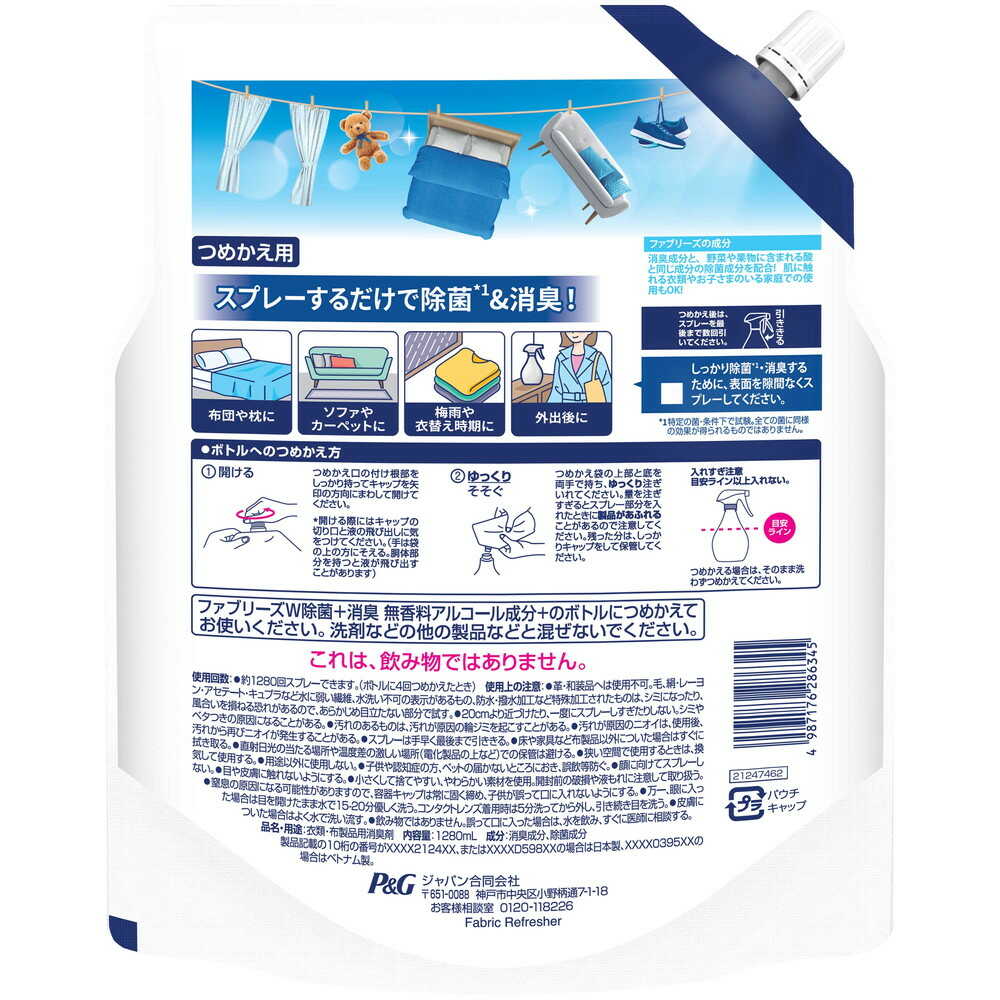 洗剤などの他の製品などと混ぜないでください。 これは、飲み物ではありません。 使用上の注意:革・和装品へは使用不可。 毛、絹・レーヨン・アセテート・キュプラなど水に弱い繊維、水洗い不可の表示があるもの、防水・撥水加工など特殊加工されたものは、シミになったり、風合いを損ねる恐れがあるので、あらかじめ目立たない部分で試す。 20cmより近づけたり、一度にスプレーしすぎたりしない。 シミやベタつきの原因になることがある。 汚れのあるものは、汚れが原因の輪ジミを起こすことがある。 汚れが原因のニオイは、使用後、汚れから再びニオイが発生することがある。 スプレーは手早く最後まで引ききる。 床や家具など布製品以外についた場合はすぐに拭き取る。 直射日光の当たる場所や温度差の激しい場所(電化製品の上など)での保管は避ける。 狭い空間で使用するときは、換気して使用する。 用途以外に使用しない。 子供や認知症の方、ペットの届かないところにおき、誤飲等防ぐ。 顔に向けてスプレーしない。 目や皮膚に触れないようにする。 小さくして捨てやすい、やわらかい素材を使用。 開封前の破損や液もれに注意して取り扱う。 窒息の原因になる可能性がありますので、容器キャップは常に固く締め、子供が誤って口に入れないようにする。 万一、眼に入った場合は目を開けたまま水で15-20分優しく洗う。 コンタクトレンズ着用時は5分洗ってから外し、引き続き目を洗う。 皮膚についた場合はよく水で洗い流す。 飲み物ではありません。 誤って口に入った場合は、水を飲み、すぐに医師に相談する。