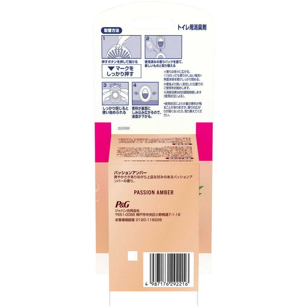 生まれかわった!つめかえタイプ 旧タイプにはつめかえできません。 トイレのニオイ分子は、壁や床の小さな凹凸に隠れています。 ファブリーズのトイレ用消臭剤は、室内の空気を継続的に消臭だけでなく、壁や床を防臭コートすることで、嫌なニオイが付着するのを防ぎます。 消臭効果は約8週間持続します(使用状況による)。 パッションアンバーの香り お得なつめかえパック4回分。必ず本体ケース入り商品をお買い求めください。