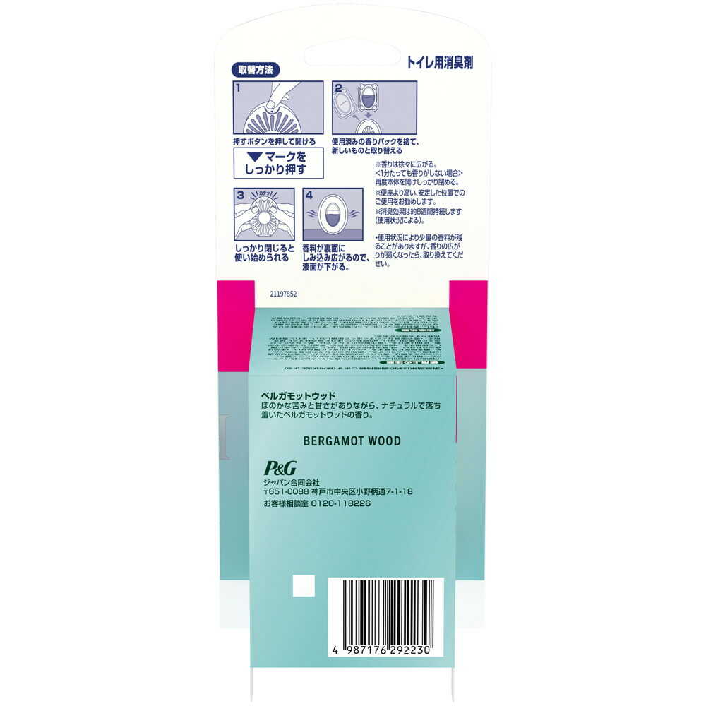 生まれかわった!つめかえタイプ 旧タイプにはつめかえできません。 トイレのニオイ分子は、壁や床の小さな凹凸に隠れています。 ファブリーズのトイレ用消臭剤は、室内の空気を継続的に消臭だけでなく、壁や床を防臭コートすることで、嫌なニオイが付着するのを防ぎます。 消臭効果は約8週間持続します(使用状況による)。 ベルガモットウッドの香り お得なつめかえパック4回分。必ず本体ケース入り商品をお買い求めください。