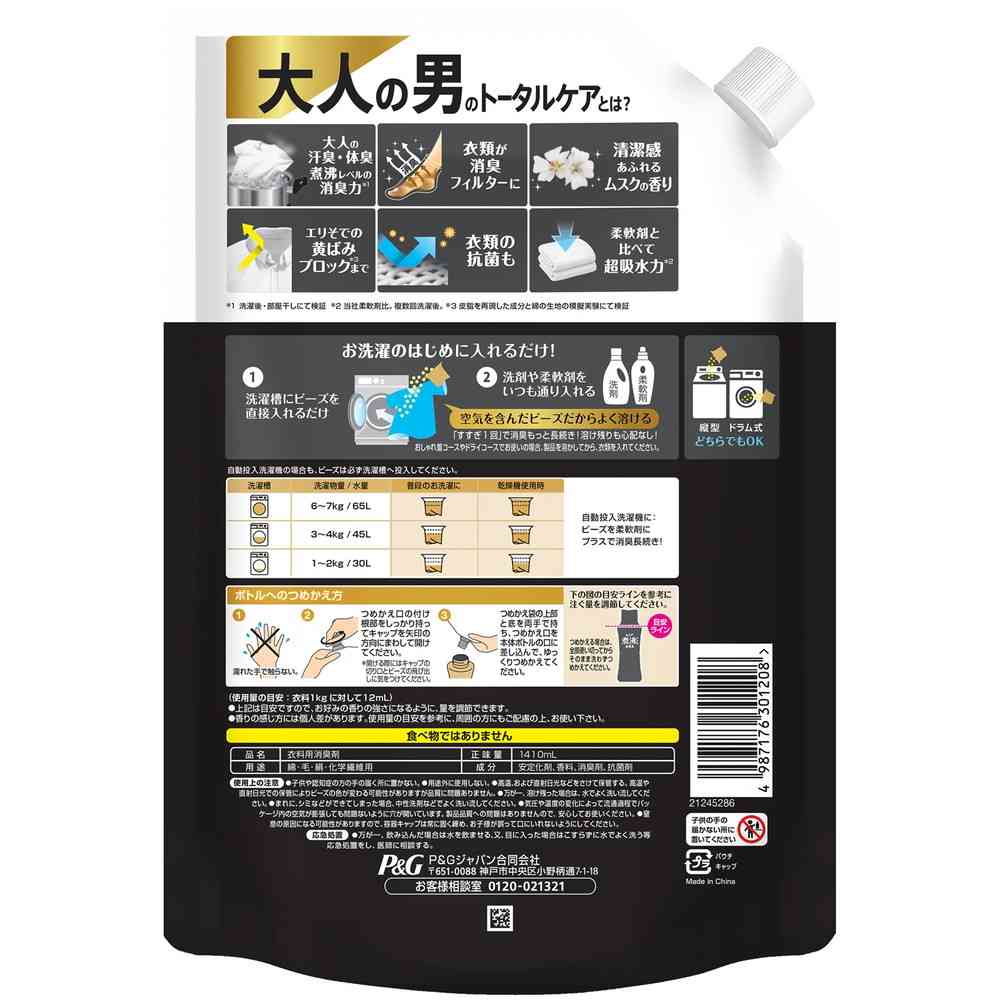 煮沸レベル消臭&さわやかムスクの香り 大人の男のトータルケア。 抗菌ビーズは、衣類の消臭専用のお洗濯ビーズ。 いつもの洗剤や柔軟剤に加えるだけで、しみついたニオイまで煮沸レベルに消臭* (*洗濯後・部屋干しにて検証。) エリそでの黄ばみも120日ブロック* (*皮脂を再現した成分と綿の生地の模擬実験にて検証) 衣類の抗菌*だけでなく、洗濯槽の防カビ*2まで (*全ての菌の増殖を抑えるわけではありません。*2既に付着していたカビや汚れを取り除くわけではありません。) 柔軟剤に比べて超吸水力* (*当社柔軟剤比。複数回洗濯後。) 使い方は簡単。洗濯前に洗濯槽に直接入れるだけ。 縦型・ドラム式、どちらの洗濯機にも使用できます。 いろいろな柔軟剤とも香りの相性バツグンです。