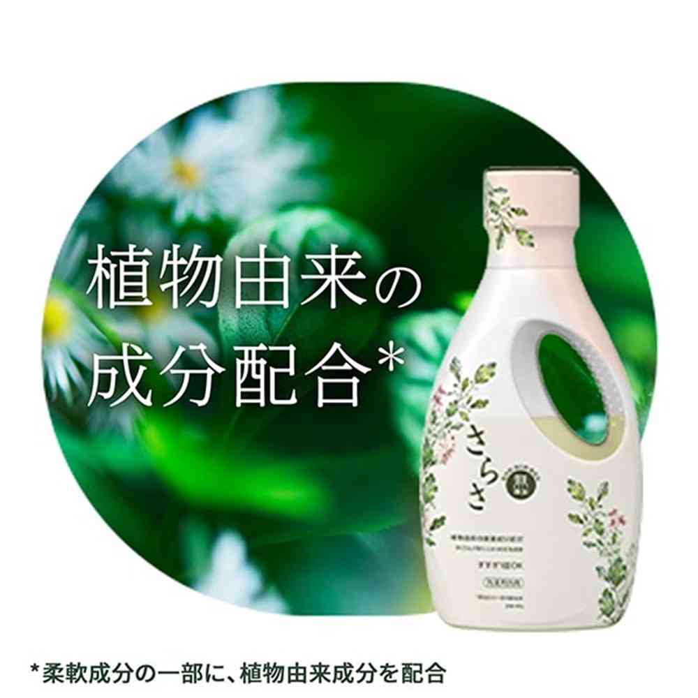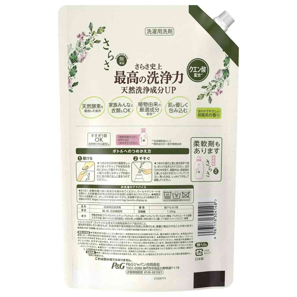 New さらさ史上最高の洗浄力 天然洗浄成分UP ●クエン酸配合※1 ●蛍光剤・漂白剤・着色料 無添加 ●植物由来の厳選成分配合※2 ●手ごわい汚れ・ニオイの元も洗浄 ●天然酵素を配合した処方 ●家族みんなの衣類もOK ●肌を優しく包み込む ※1 洗浄補助剤として ※2 柔軟成分の一部が植物由来 ●洗濯洗剤 液体