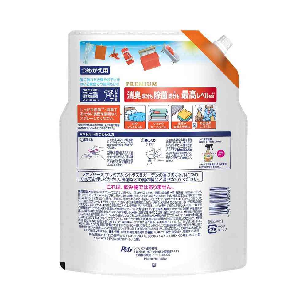 P&G、P&Gジャパン、P&Gジャパン合同会社、ピーアンドジー、ファブリーズ、お部屋用、衣類、コート、制服、ソファ、カーペット、家具、布用、除菌、消臭、防臭、抗菌、脱臭、芳香剤、スプレー、ミスト、スプレー、プレミアム、詰替、詰替え、詰め替え、レフィル、入替、中身