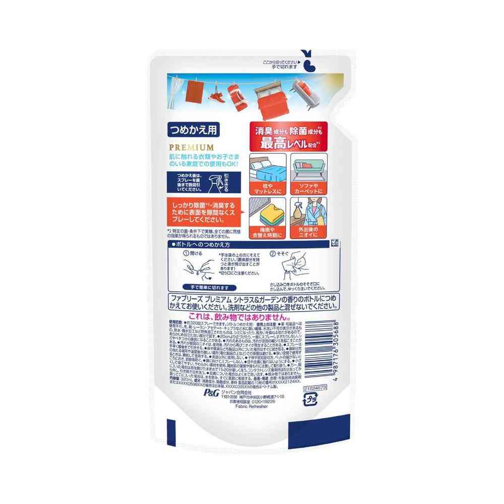 P&G、P&Gジャパン、P&Gジャパン合同会社、ピーアンドジー、ファブリーズ、お部屋用、衣類、コート、制服、ソファ、カーペット、家具、布用、除菌、消臭、防臭、抗菌、脱臭、芳香剤、スプレー、ミスト、スプレー、プレミアム、詰替、詰替え、詰め替え、レフィル、入替、中身