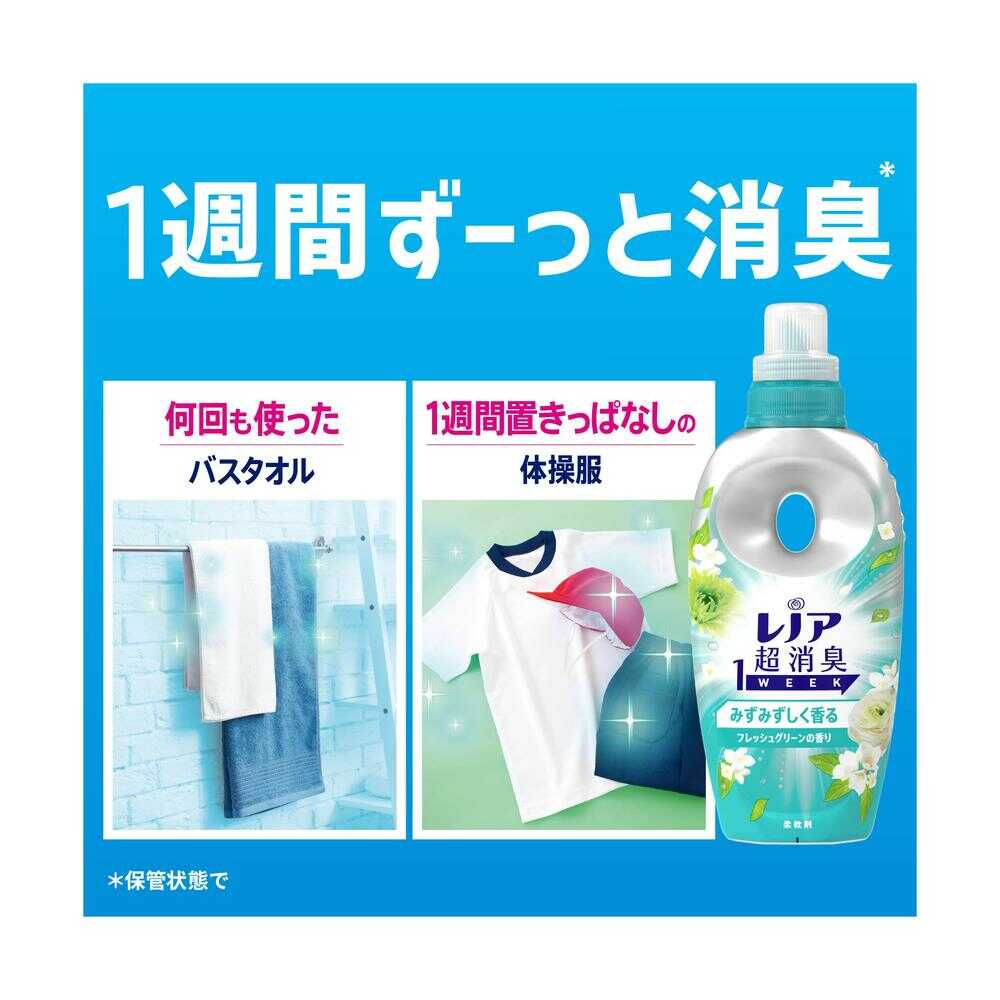 汗をかいた時のニオイはもちろん、ベタつきまで防げるようになりました*1。 汗をかいてもさらっと吸収して速乾*1。 しかもレノア超消臭1WEEKなら、幅広いニオイをこれ一本で消臭! 洗濯でなかなか落ちないタフな汗臭・生乾き臭・体臭も、レノア超消臭なら消臭して、さわやかに仕上げます! さらに、レノア超消臭1WEEKは、1週間ずーっと続く消臭力*3。 いやなニオイを中和する「無臭化技術」に加えて、「1週間ずーっと消臭する技術」で、今まで以上に、効果的に消臭成分が長時間持続します。 かけっぱなしの洗面所のタオルや、ニオイが気になるけれど毎日は洗えない、シーツや枕カバーまで、1週間ずーっと爽やか*3。 フレッシュグリーンの香りは、みずみずしい、王道のグリーンの香り。 *1自社他柔軟剤と比較。 *2柔軟剤未使用と比較。すべてのニオイを0にするわけではありません。 *3保管状態で