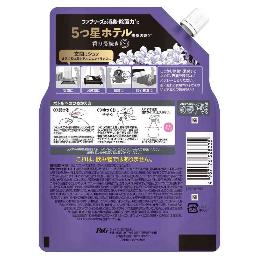 P&G、P&Gジャパン、P&Gジャパン合同会社、ピーアンドジー、レノア、ハピネス、ミスト、フレグランス、消臭、芳香、衣類、コート、スーツ、洗濯できない、ホワイトムスク、詰め替え、つめかえ、詰替え、レフィル
