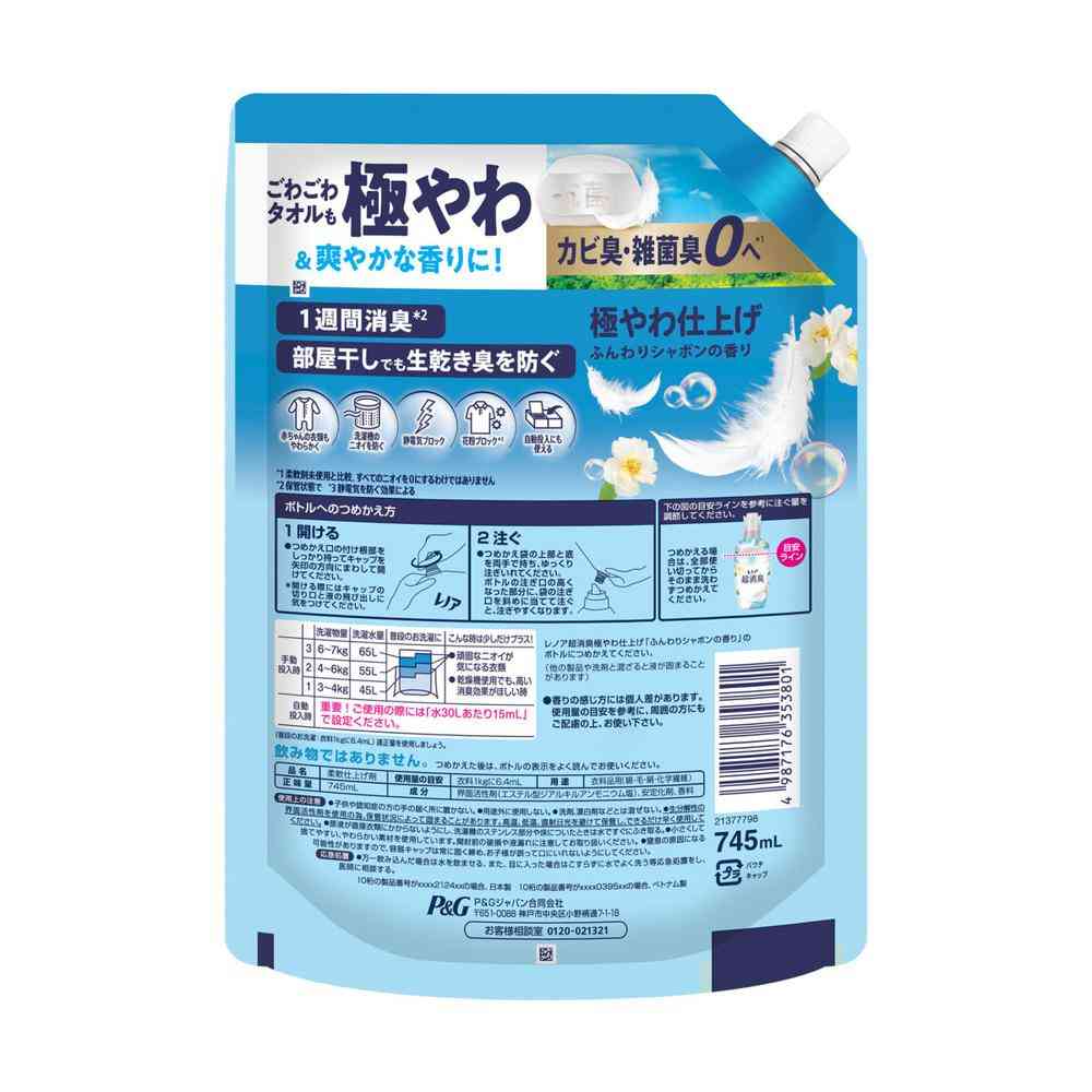 P&G、P&Gジャパン、P&Gジャパン合同会社、ピーアンドジー、レノア、柔軟剤、ソフナー、洗濯、洗濯機、タオル、衣類、洋服、ふわふわ、芳香、香り、消臭、除菌、つめかえ、詰め替え、詰替、レフィル、大容量、お徳用
