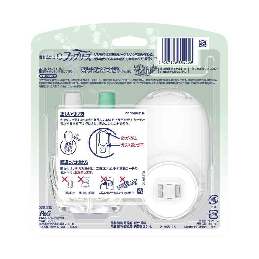 用途以外に使用しない。 子どもやペットに触れさせない。 認知症の方などの誤飲を防ぐため、置き場所に注意する。 目、肌、衣服との接触を避ける使用期間中は説明書を保管しておくこと。 家庭用交流100Vの電源で使用する。 本体器具には、この製品専用のつけかえ品のみ使用する。 他の液体を入れたり、他の物を使用すると、中毒や火災の危険がある。 本体は定期的に点検する。 お手入れする際はコンセントから抜き、乾いた布を使用する。 分解したり強い衝撃を与えたりしない。 故障または破損した場合はコンセントから取り外す。 この製品の使用において、補助が必要な方、子どもがこの製品で遊ぶことがないように注意する。 濡れた手や金属製品で触らない。感電の恐れがある。 使用の際は周囲50cmには物を置かない。 製品を新聞や布団など隠れたり覆われたりする場所で使用しない。 液体がこぼれた場合は直ちにふき取る。 つけかえ品が空になったら本体をコンセントから取り外す。 火気の付近で使用しない。 換気された場所での屋内使用専用。 つけかえボトルはガラス製なので取扱いに注意する。 本体が過度に熱くなったり、異常なにおいや煙が発生した場合は、すぐにコンセントから取り外す。 逆さや横向きでは使用不可。 器具上部の蒸散口に手で触れたり、中に指を入れたりしない。 応急処置:もし、誤って飲み込んだ場合は、水を飲み、医師に相談する。万一、皮膚についたり、目に入ったりした場合は、水で十分に洗い流す。それでも違和感がとれない場合は医師に相談する。 液漏れして床などにダメージをあたえる恐れがある。 逆さ付け 横・ななめ付け 二股コンセントや延長コードの使用不可。