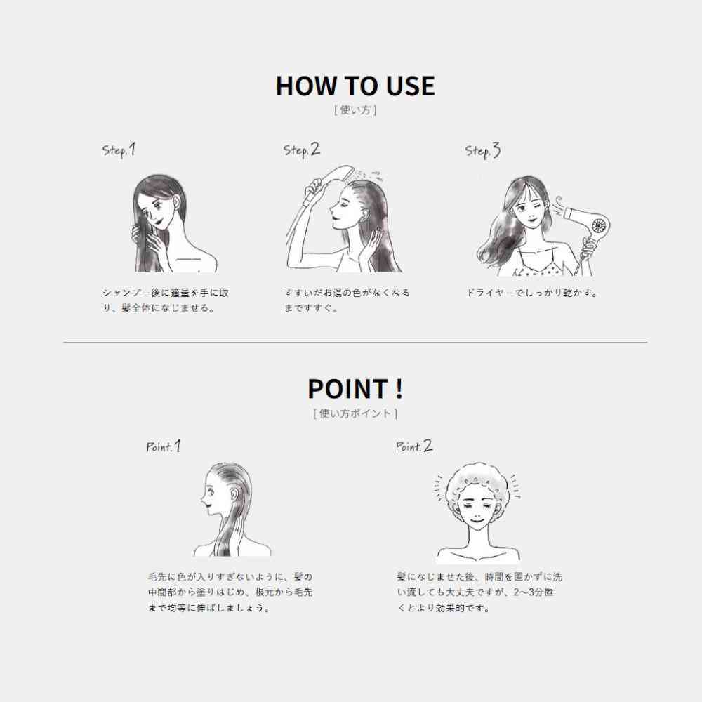 水、セテアリルアルコール、グリセリン、ベヘントリモニウムクロリド、ジメチコン、イソノナン酸イソノニル、DPG、マカデミア種子油、ジフェニルシロキシフェニルトリメチコン、ラノリン、イソアルキル(C10-40)アミドプロピルエチルジモニウムエトサルフェート、アミノプロピルジメチコン、アルギニン、酒石酸、セタノール、タウリン、フェノキシエタノール、ベヘントリモニウムメトサルフェート、香料、(+/-)塩基性青75、塩基性紫2、塩基性茶16