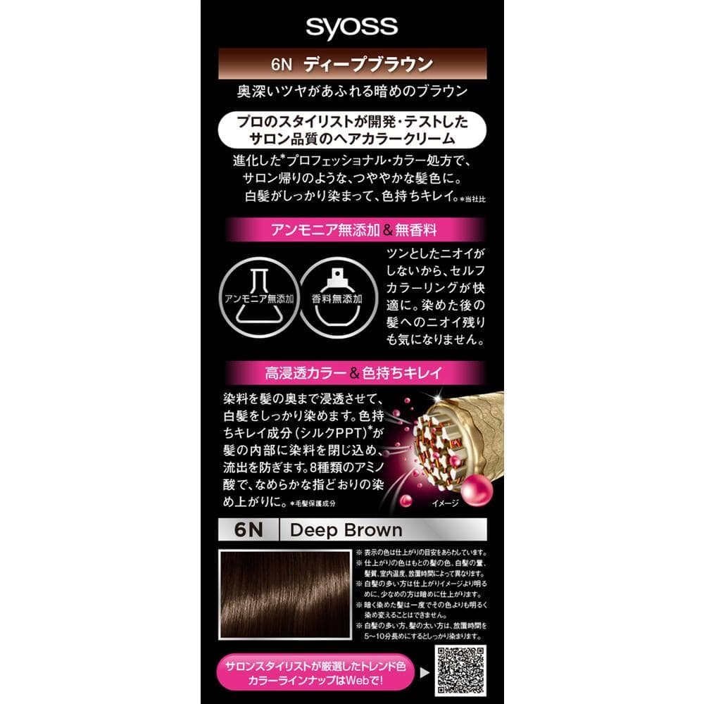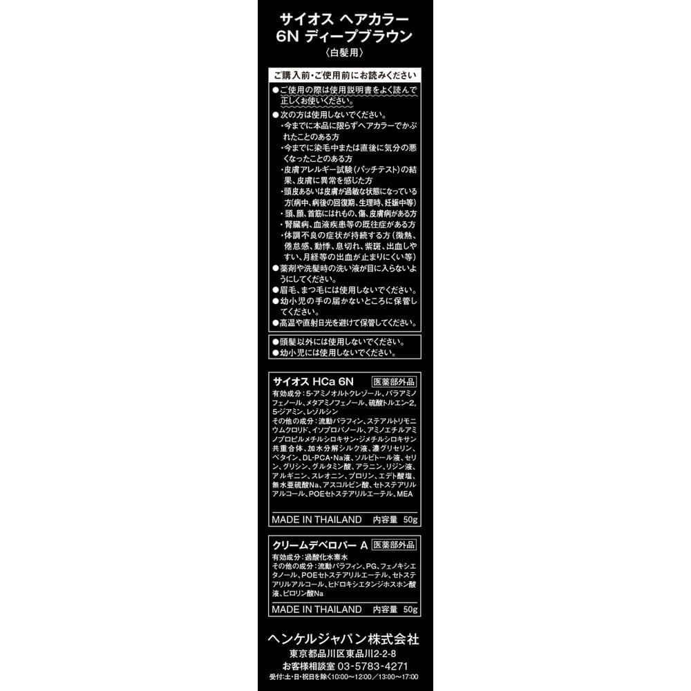 プロフェッショナル・カラー処方のサイオス アンモニア無添加・香料無添加に改良。 「ツンとした」ニオイがしないから、セルフカラーリングが快適に。 染めた後の髪へのニオイ残りも気になりません。 高浸透カラーで白髪がしっかり染まって、きれいな色持ち。 染料を髪の奥に浸透させて白髪をしっかり染めます。 また、色持ちキレイ成分(シルクPPT)*が髪の内部に染料を閉じ込め、流出を防ぐから長く髪色を楽しめます。 また8種類のアミノ酸を配合、なめらかな指どおりの染め上がりに。 *毛髪保護成分 1剤:50g/2剤:50g、手袋、コームブラシ、トレー入り。 サイオスヘアカラークリーム。6N。ディープブラウン。
