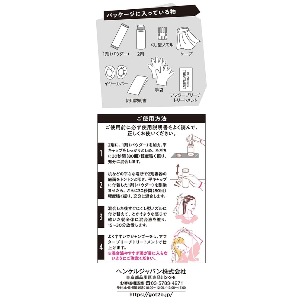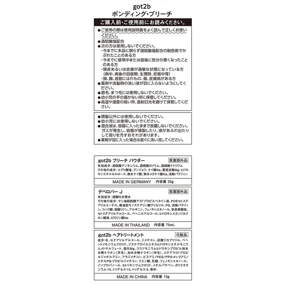 ご購入前・ご使用前にお読みください。 ●ご使用の際は使用説明書をよく読んで正しくお使いください。 ●過硫酸塩配合 ●次の方は使用しないでください。 ・今までに本品に限らず過硫酸塩配合の脱色剤でかぶれたことのある方 ・今までに使用中または直後に気分の悪くなったことのある方 ・頭皮あるいは皮膚が過敏な状態になっている方(病中、病後の回復期、生理時、妊娠中等) ・頭、顔、首筋にはれもの、傷、皮膚病がある方 ●薬剤や洗髪時の洗い液が目に入らないようにしてください。 ●眉毛、まつ毛には使用しないでください。 ●頭髪以外には使用しないでください。 ●幼小児には使用しないでください。 ●混合液は、容器に入ったままで放置しないでください。 ガスが発生し、容器が破損したり、液があふれ出たりして周りを汚すおそれがあります。 ●薬剤が目に入った場合は直ぐに洗い流してください。
