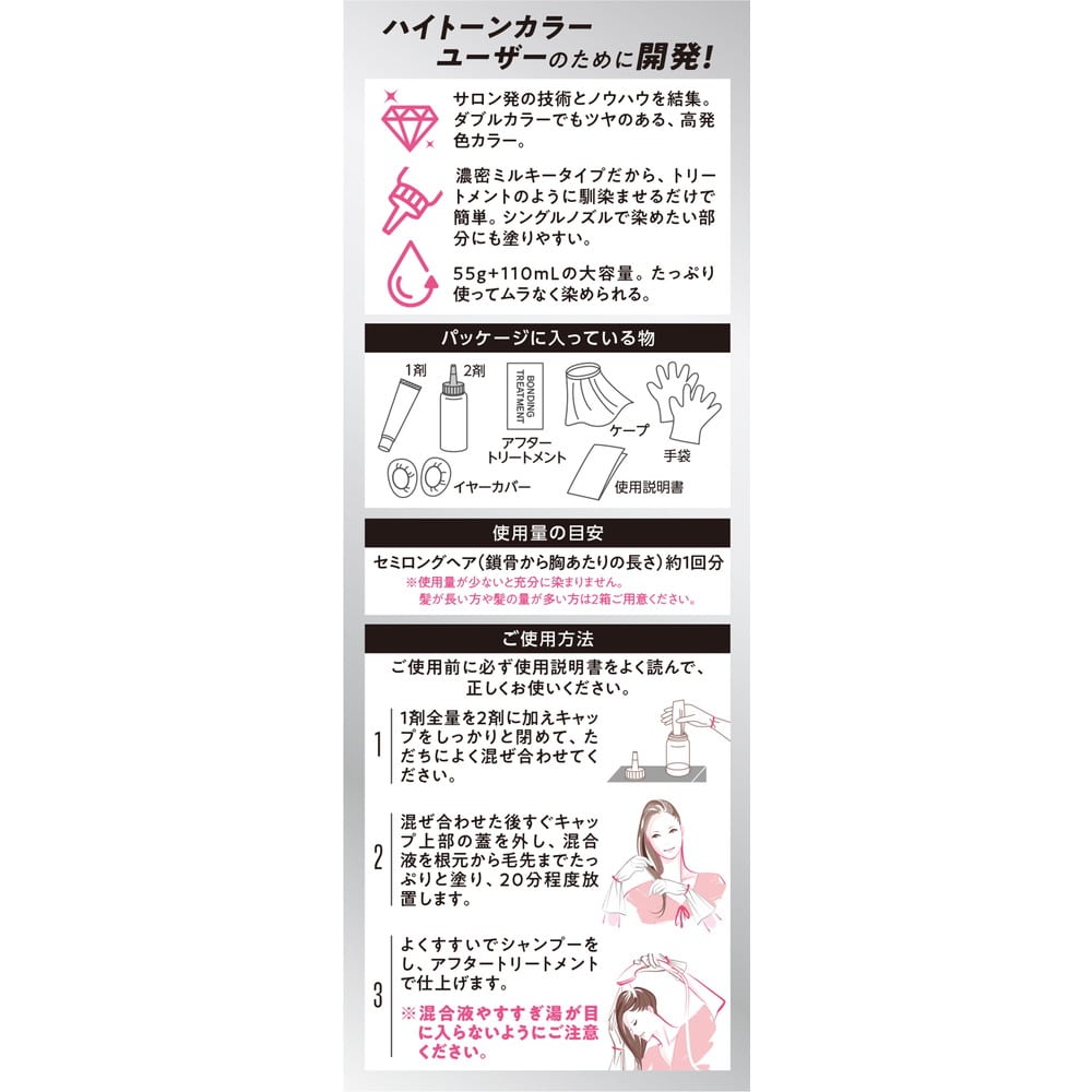 ご購入前・ご使用前にお読みください。 ●ご使用の際は使用説明書をよく読んで正しくお使いください。 ●次の方は使用しないでください。 ・今までに本品に限らずヘアカラーでかぶれたことのある方 ・今までに染毛中または直後に気分の悪くなったことのある方 ・皮膚アレルギー試験(バッチテスト)の結果、皮膚に異常を感じた方 ・頭皮あるいは皮膚が過敏な状態になっている方(病中、病後の回復期、生理時、妊娠中等) ・頭、顔、首筋にはれもの、傷、皮膚病がある方 ・腎臓病、血液疾患等の既往症がある方 ・体調不良の症状が持続する方(微熱、倦怠感、動悸、息切れ、紫斑、出血しやすい、月経等の血が止まりにくい等) ●薬剤や洗髪時の洗い液が目に入らないようにしてください。 ●眉毛、まつ毛には使用しないでください。 ●幼小児の手に届かない所に保管してください。 ●高温や湿度の高い所、直射日光を避けて保管してください。 ●頭髪以外には使用しないでください。 ●幼小児には使用しないでください。 ●本品は白髪用ではありません。