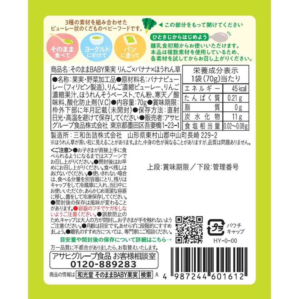 りんご、バナナ、ほうれん草を組み合わせた、ピューレー状のくだものベビーフードです。 開けてそのまま、手軽にうらごし食感のくだものをお子さまにあげることができます。 果実・野菜100%相当、複数のくだものと野菜入り。
