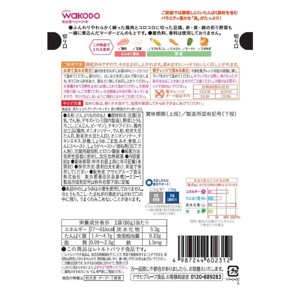 家庭では調理しにくいたんぱく素材を含む、バラエティ豊かな「具」がたっぷり入ったレトルトパウチタイプのベビーフード。 ふんわりやわらかく練った鶏肉とコロコロに切った豆腐、赤・黄・緑の彩り野菜も一緒に煮込んだマーボーどんのもとです。 着色料、香料不使用。