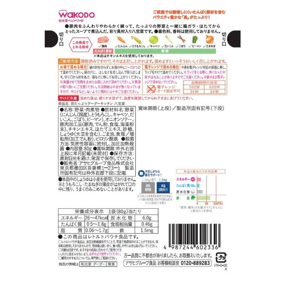 家庭では調理しにくいたんぱく素材を含む、バラエティ豊かな「具」がたっぷり入ったレトルトパウチタイプのベビーフード。 豚肉をふんわりやわらかく練って、たっぷりの野菜と一緒に鶏ガラ・ほたてからとったスープで煮込んだ、彩り具材入り八宝菜です。 着色料、香料不使用。