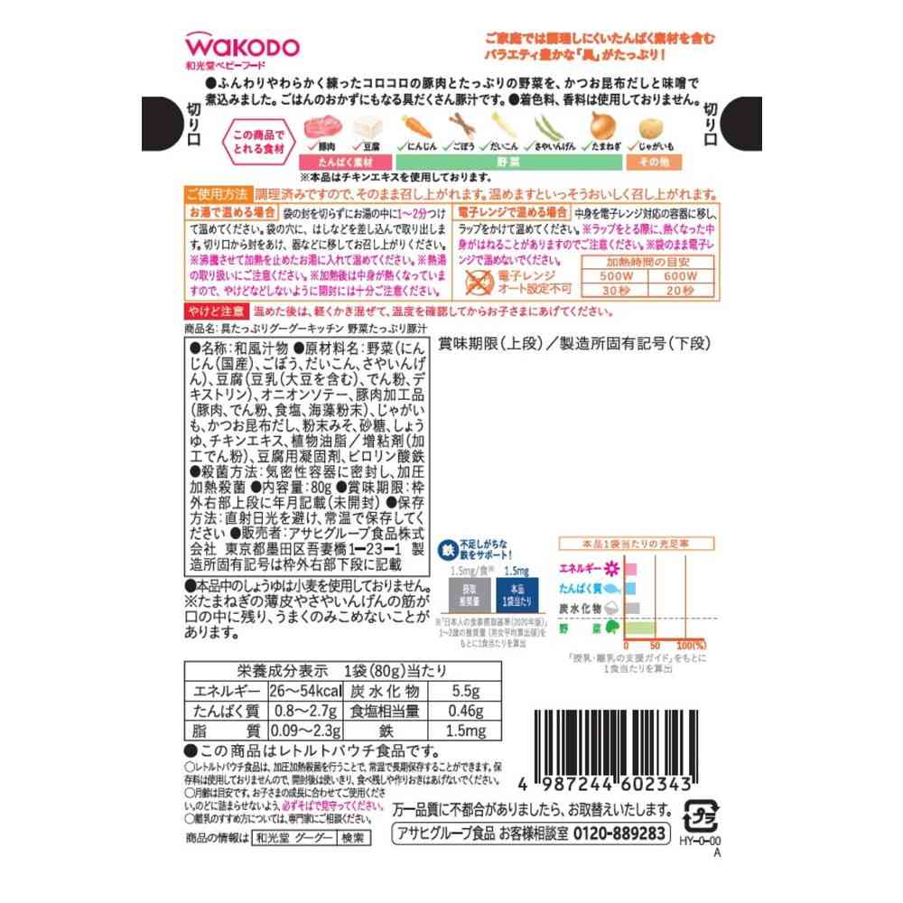 家庭では調理しにくいたんぱく素材を含む、バラエティ豊かな「具」がたっぷり入ったレトルトパウチタイプのベビーフード。 ふんわりやわらかく練ったコロコロの豚肉とたっぷりの野菜を、かつお昆布だしと味噌で煮込みました。 ごはんのおかずにもなる具だくさん豚汁です。 着色料、香料不使用。