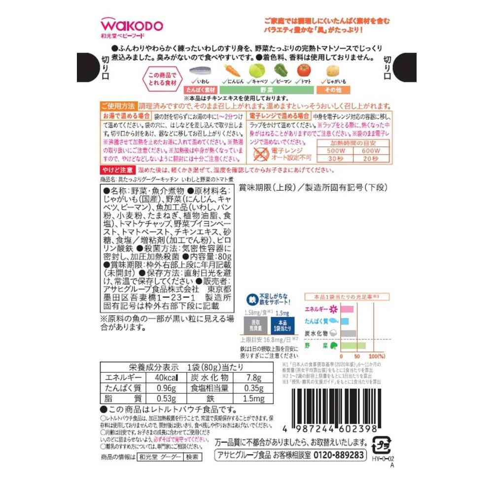 家庭では調理しにくいたんぱく素材を含む、バラエティ豊かな「具」がたっぷり入ったレトルトパウチタイプのベビーフード。 ふんわりやわらかく練ったいわしのすり身を、野菜たっぷりの完熟トマトソースでじっくり煮込みました。 臭みがないので食べやすいです。 着色料、香料不使用。
