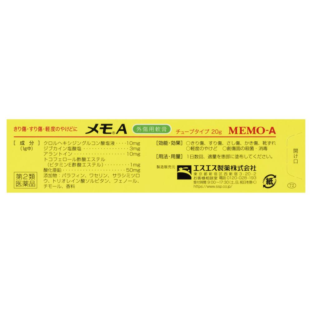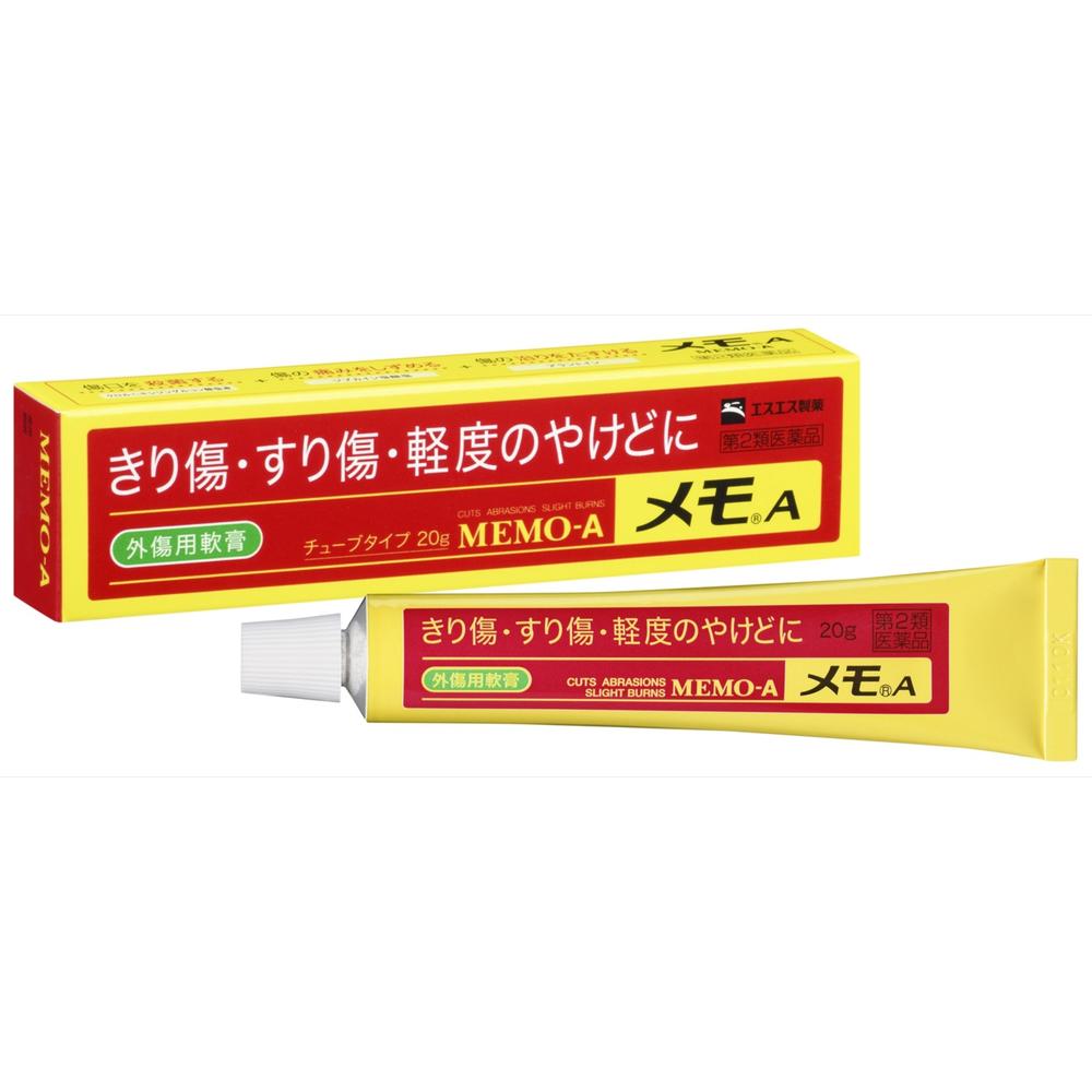 ●メモAは、殺菌剤、傷の痛みをしずめる局所麻酔剤、傷の治りをはやめる成分などを配合したなめらかで伸びのよい軟膏です。
