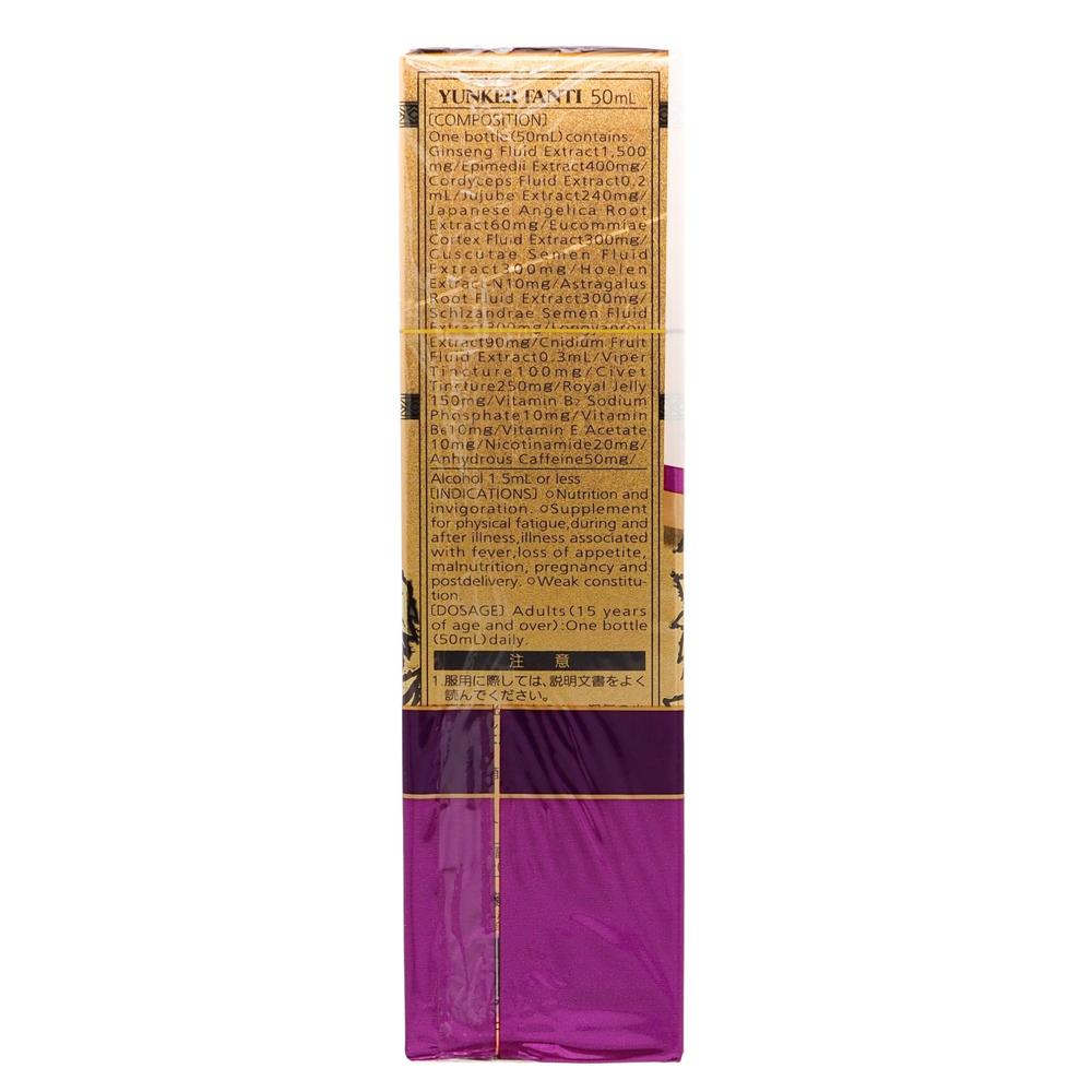ニンジン流エキス・1,500mg、イカリソウエキス・400mg、冬虫夏草流エキス・0.2mL、タイソウエキス・240mg、トウキエキス・60mg、トチュウ流エキス・300mg、トシシ流エキス・300mg、ブクリョウエキス‐N・10mg、オウギ流エキス・300mg、ゴミシ流エキス・300mg、竜眼肉エキス・90mg、ジャショウシ流エキス・0.3mL、反鼻チンキ・100mg、シベットチンキ・250mg、ローヤルゼリー・150mg、ビタミンB2リン酸エステル・10mg、ビタミンB6・10mg、ビタミンE酢酸エステル・10mg、ニコチン酸アミド・20mg、無水カフェイン・50mg